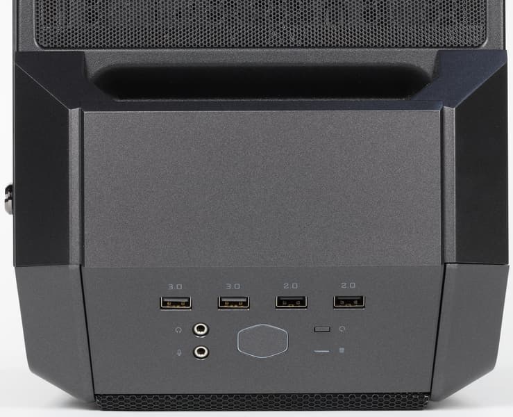 Как и в других корпусах серии, органы управления и внешние порты расположены очень удачно: на широком наклонном переходе от лицевой панели к верхней. То есть они будут легко доступны при любом размещении компьютера — на столе, на полу или на низкой подставке. Но угол наклона панели управления таков, что она «смотрит» скорее вверх, чем вперед, и если сидящий рядом с компьютером оператор имеет рост ниже среднего, то при настольной установке ему, скорее всего, придется приподниматься.