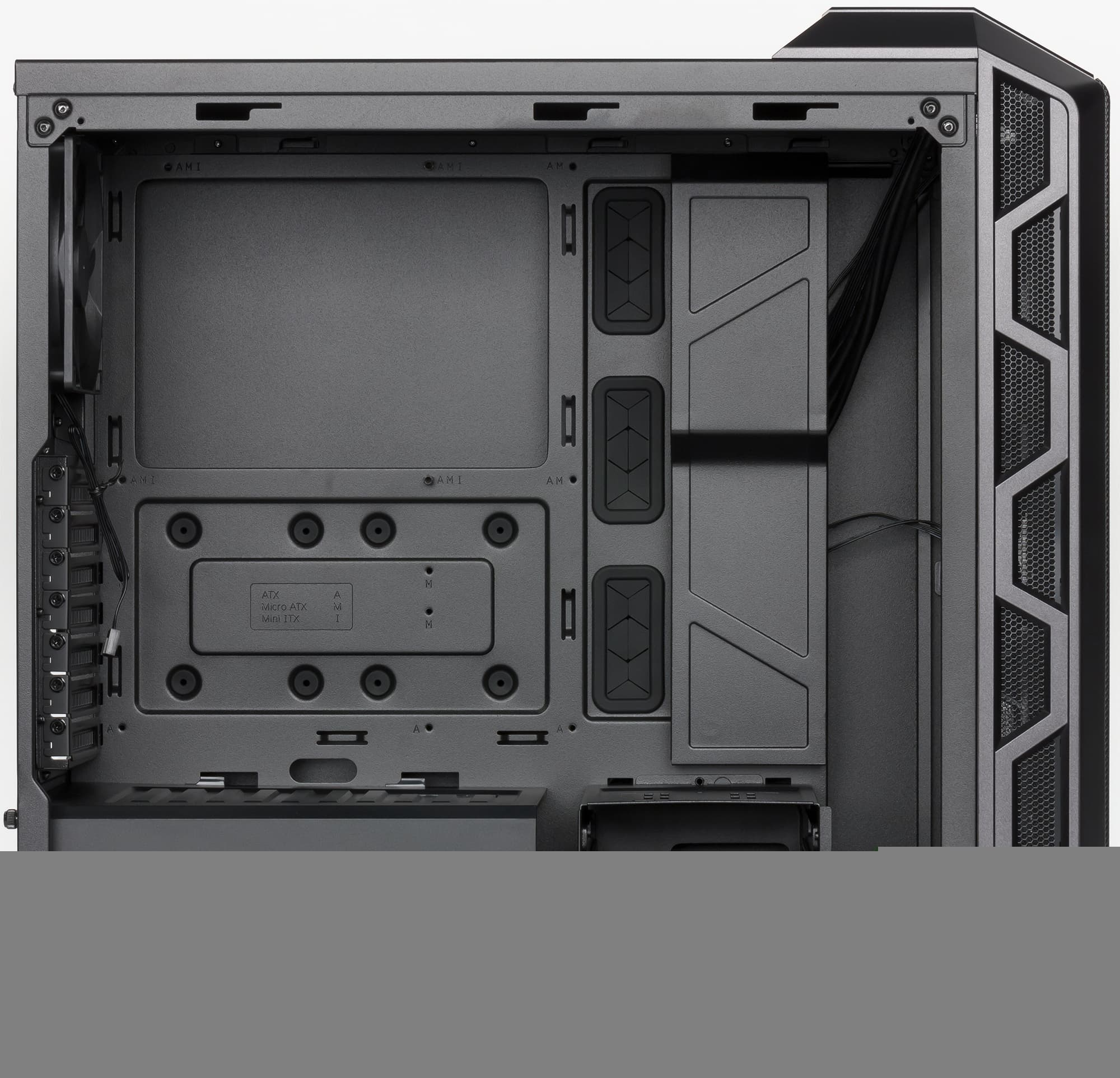 В основании системной платы есть большая прорезь, которая обеспечивает возможность снятия некоторых типов кулеров CPU без демонтажа самой платы. Пластиковой крышки, закрывающей у корпуса MasterCase H500P это отверстие справа, в данном случае нет.