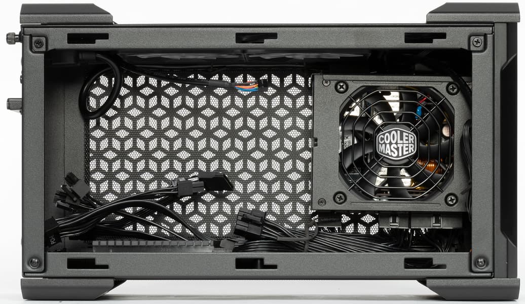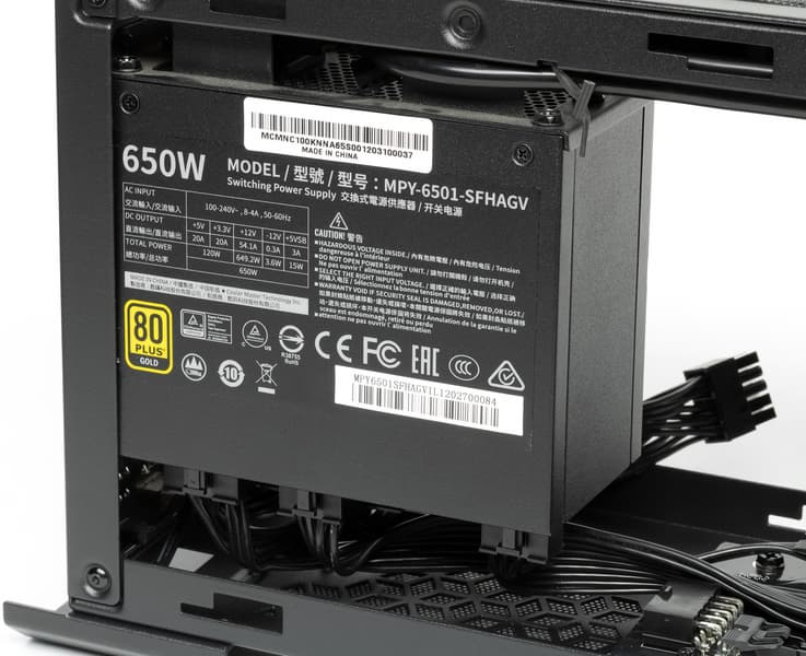 БП имеет мощность 650 Вт и съемные кабели — на этом производитель не экономил. И это важно, поскольку в первую очередь NC100 ориентирован на использование мощных дискретных видеокарт длиной до 320 мм. Карты занимают свою половину корпуса, а БП установлен перед Compute Element (более коротким), почему и удалось реализовать такую схему. Единственный ее недостаток: идущий внутри кабель питания от разъема на задней панели до БП иногда немного мешает. Но к этому приходится относиться как к неизбежности. Стоит отметить, что установленный в NC100 блок питания в рознице стоит больше половины комплекта. Можно сказать, это ключевой элемент.