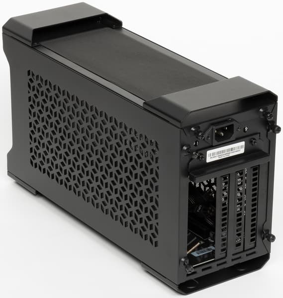 Интересно выглядит базовая плата: на ней только два разъема PCIe x16, то есть увеличенная толщина пошла на увеличение промежутка между Compute Element и видеокартой. Учитывая, что у многих видеокарт заметно нагревается и задняя стенка, это не лишняя предосторожность. Также это позволяет «впихнуть» посередине воздуховод, посредством которого вентилятор Compute Element будет забирать воздух не из внутреннего пространства, а снизу.