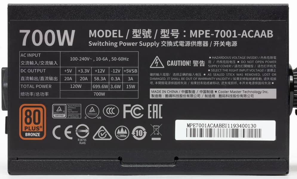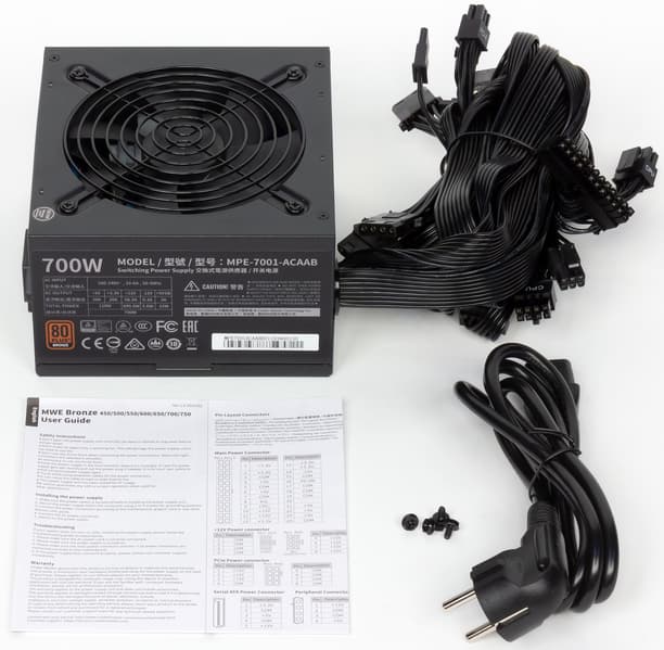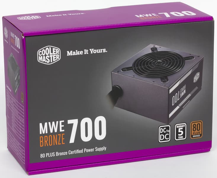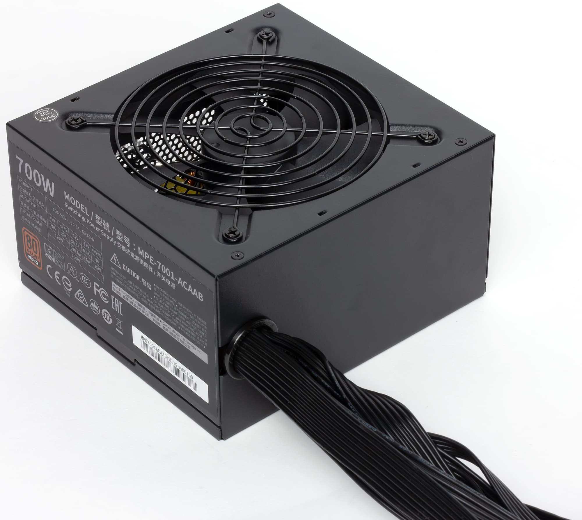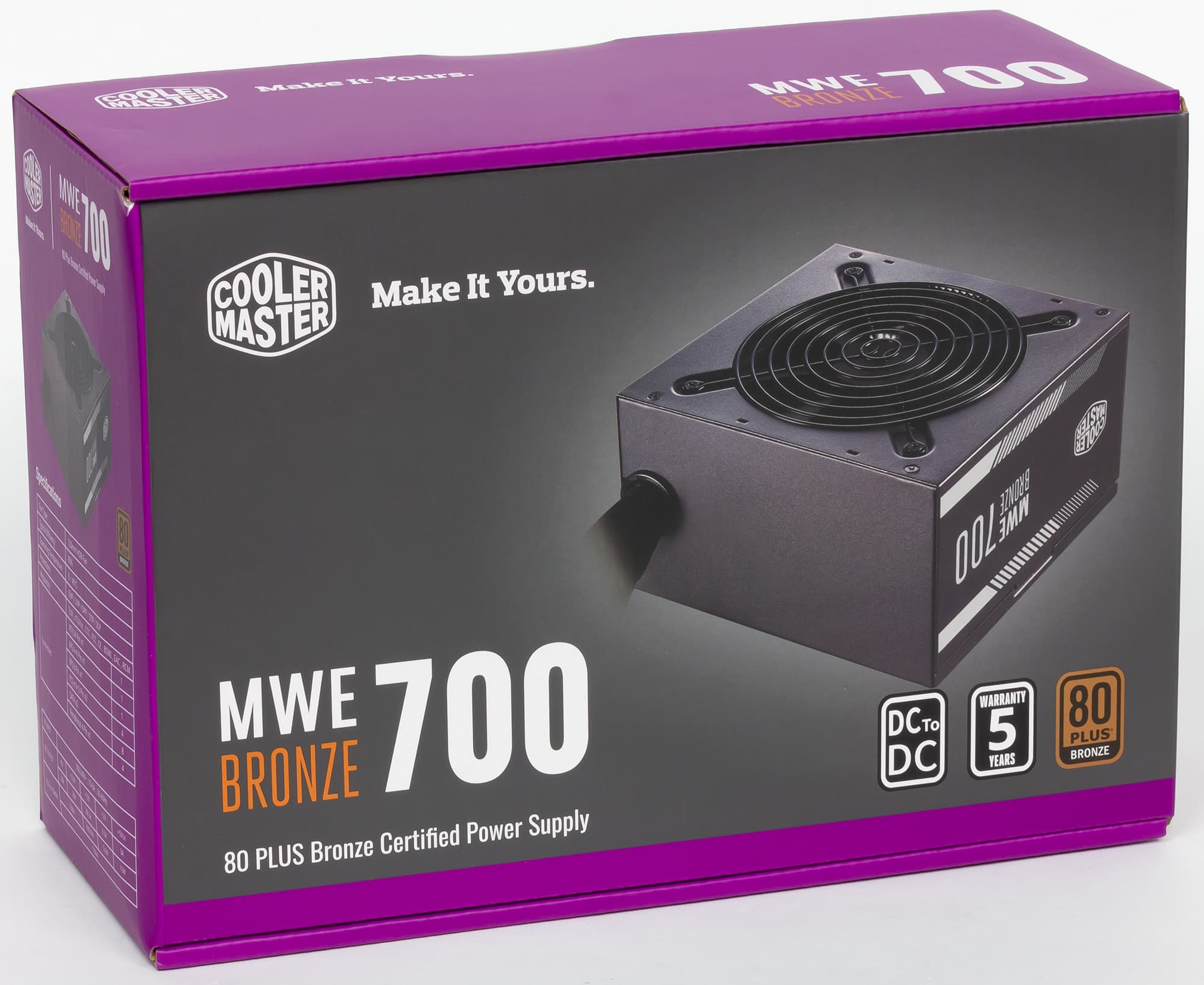 В серии MWE Bronze компании Cooler Master представлено семь моделей БП мощностью от 450 до 750 Вт с шагом 50 Вт. Все эти источники питания имеют сертификат 80Plus Bronze, нам предстоит познакомиться с одним из представителей данной немногочисленной группы — блоком питания Cooler Master MWE 700 Bronze (V2) с названием модели MPE-7001-ACAAB. В российской рознице на момент публикации обзора он стоил примерно 4500-5000 рублей.