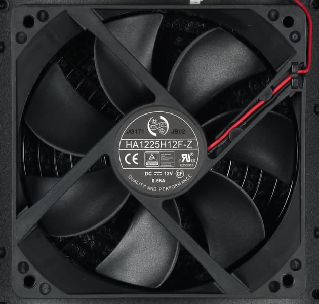 В блоке питания установлен вентилятор Honghua HA1225H12F-Z типоразмера 120 мм. Вентилятор основан на гидродинамическом подшипнике и имеет скорость вращения 2200 об/мин, согласно данным производителя. Подключение двухпроводное через разъем.