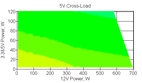 Следующим этапом инструментального тестирования является построение кросснагрузочной характеристики (КНХ) и представление ее на четвертьплоскости, ограниченной максимальной мощностью по шине 3,3&5 В с одной стороны (по оси ординат) и максимальной мощностью по шине 12 В с другой (по оси абсцисс). В каждой точке измеренное значение напряжения обозначается цветовым маркером в зависимости от отклонения от номинального значения.