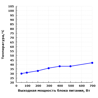 Также стоит учитывать, что в случае работы с остановленным вентилятором температура компонентов внутри БП сильно зависит от окружающей температуры воздуха, и если та установится на уровне 40-45 °C, это приведет к более раннему включению вентилятора.
