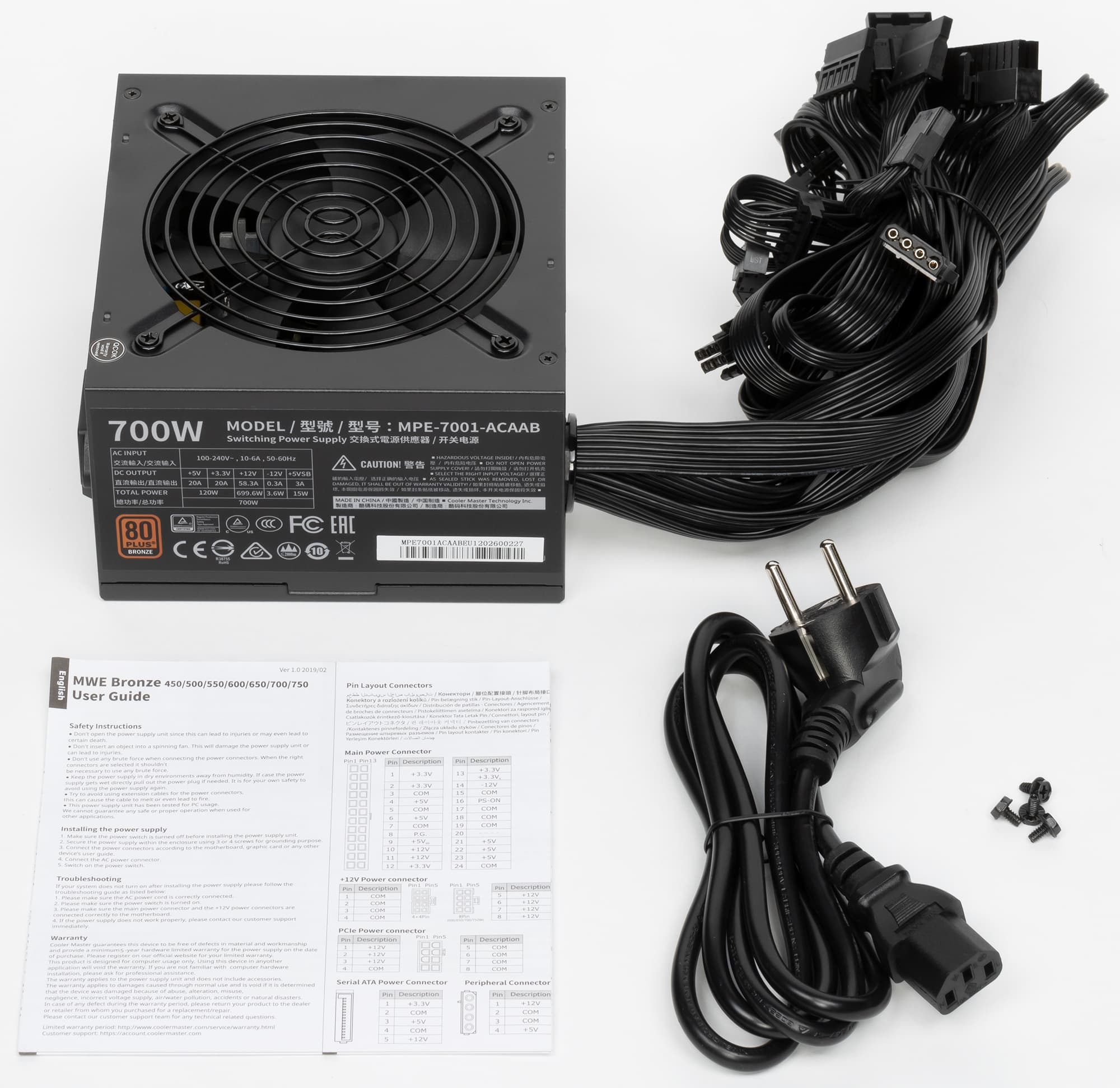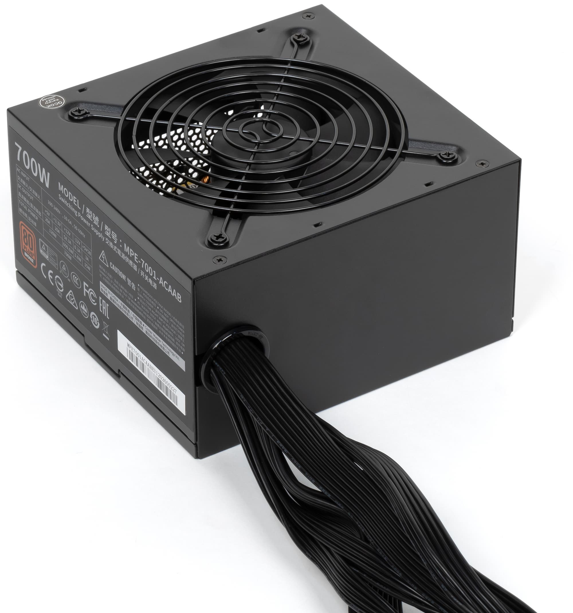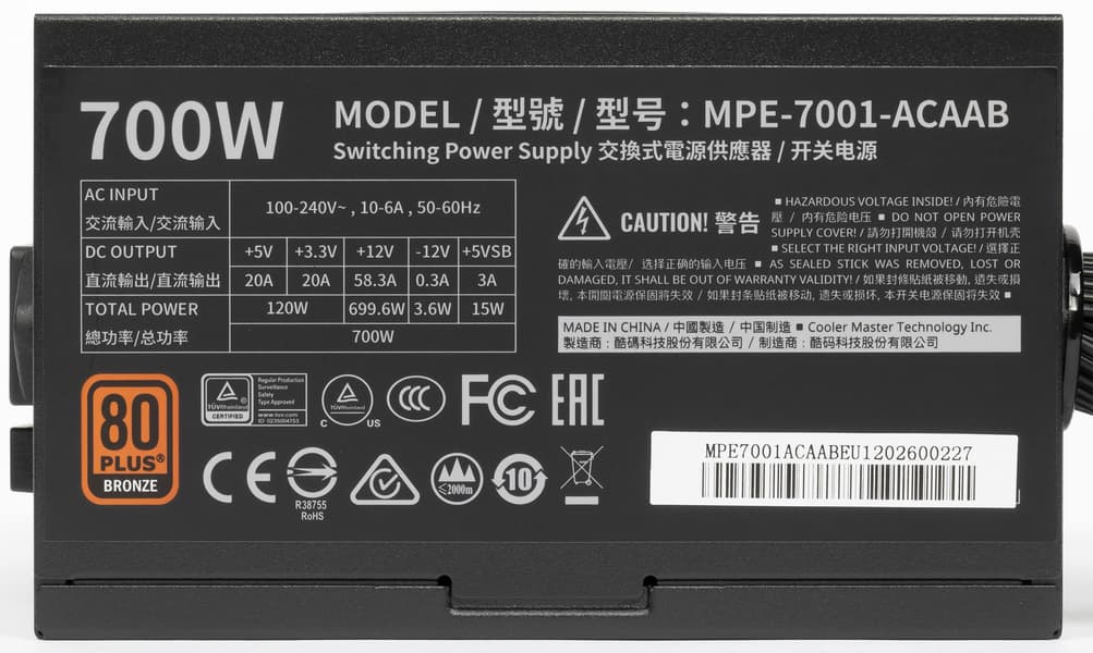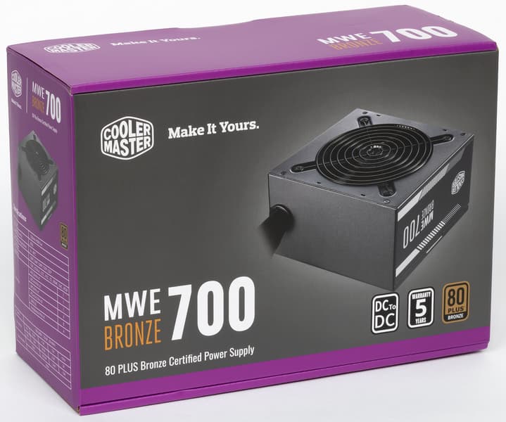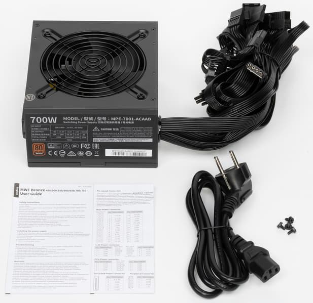 В серию блоков питания MWE Bronze V2 компании Cooler Master входит семь моделей, которые распределены с шагом 50 Вт по шкале мощности от 450 до 750 Вт. Нам была предоставлена для тестирования почти старшая модель мощностью 700 Вт (MPE-7001-ACAAB).