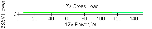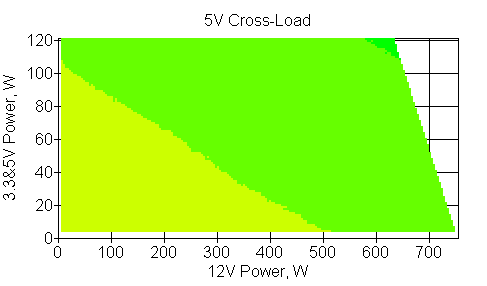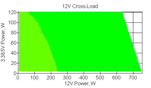 Следующим этапом инструментального тестирования является построение кросснагрузочной характеристики (КНХ) и представление ее на четвертьплоскости, ограниченной максимальной мощностью по шине 3,3&5 В с одной стороны (по оси ординат) и максимальной мощностью по шине 12 В с другой (по оси абсцисс). В каждой точке измеренное значение напряжения обозначается цветовым маркером в зависимости от отклонения от номинального значения.