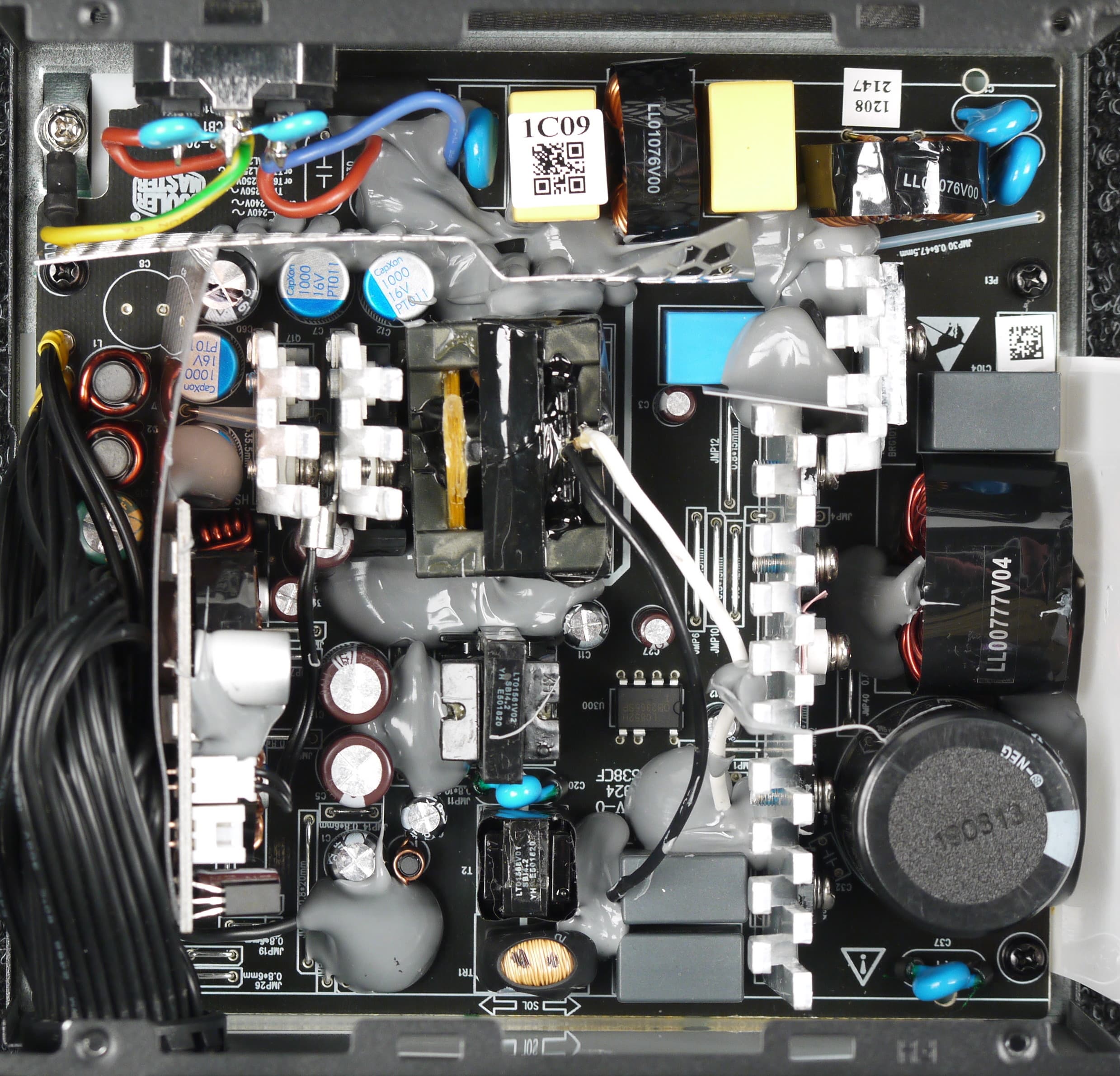 Конструкция блока питания вполне соответствует современным тенденциям: активный корректор коэффициента мощности, синхронный выпрямитель для канала +12VDC, независимые импульсные преобразователи постоянного тока для линий +3.3VDC и +5VDC.