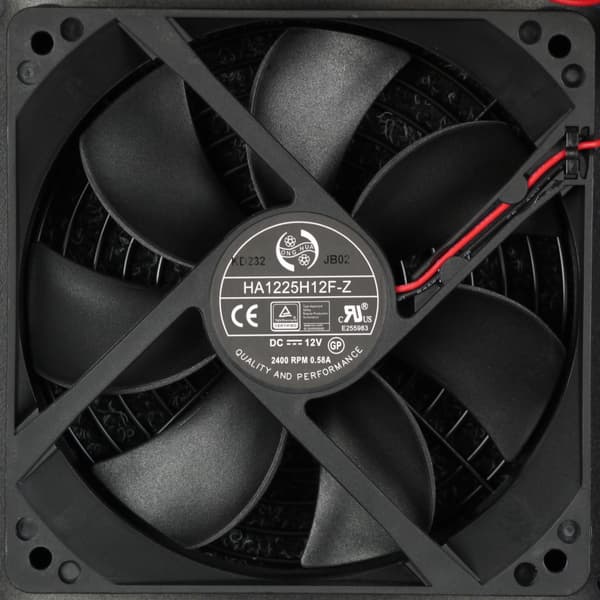 В блоке питания установлен вентилятор Honghua HA1225H12F-Z типоразмера 120 мм. Вентилятор основан на гидродинамическом подшипнике и имеет, согласно данным производителя, скорость вращения 2400 об/мин. Подключение двухпроводное через разъем.