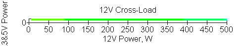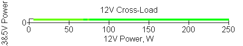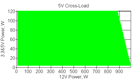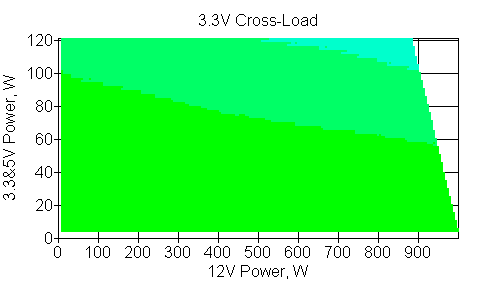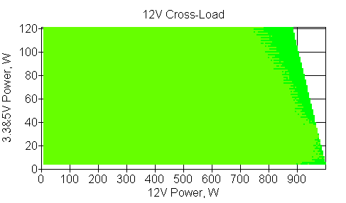 Следующим этапом инструментального тестирования является построение кросснагрузочной характеристики (КНХ) и представление ее на четвертьплоскости, ограниченной максимальной мощностью по шине 3,3&5 В с одной стороны (по оси ординат) и максимальной мощностью по шине 12 В с другой (по оси абсцисс). В каждой точке измеренное значение напряжения обозначается цветовым маркером в зависимости от отклонения от номинального значения.