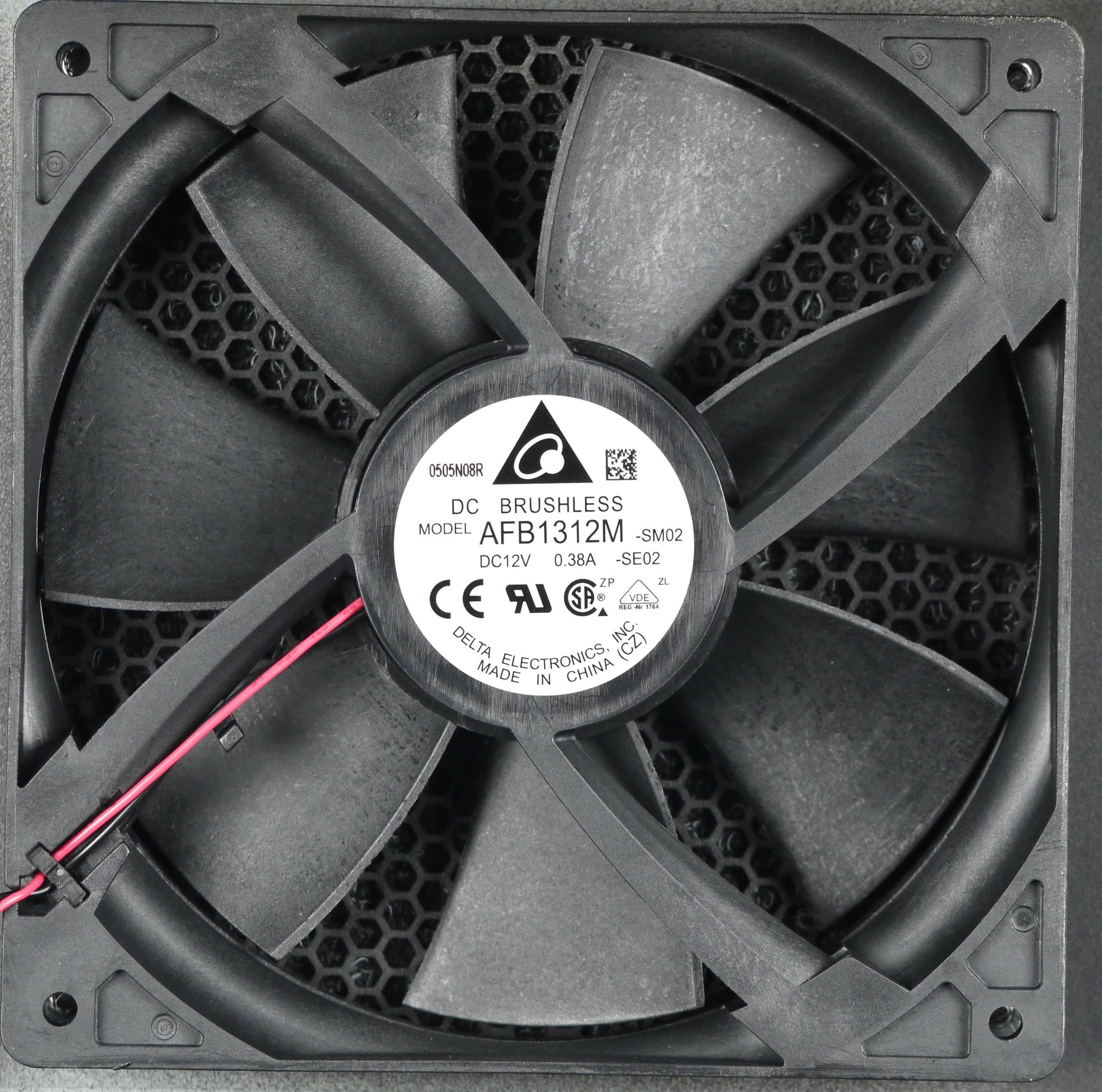 Под штампованной решеткой установлен вентилятор AFB1312M типоразмера 135 мм производства Delta Electronics. Данная модель вентилятора основана на подшипнике качения и имеет максимальную скорость вращения 4500 об/мин при номинальном напряжении питания 12 В. Подключение разъемное двухпроводное.