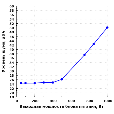 При работе в диапазоне мощности до 400 Вт включительно шум блока питания находится на уровне менее 25 дБА с расстояния 0,35 метра. Подобный уровень шума можно считать действительно низким.