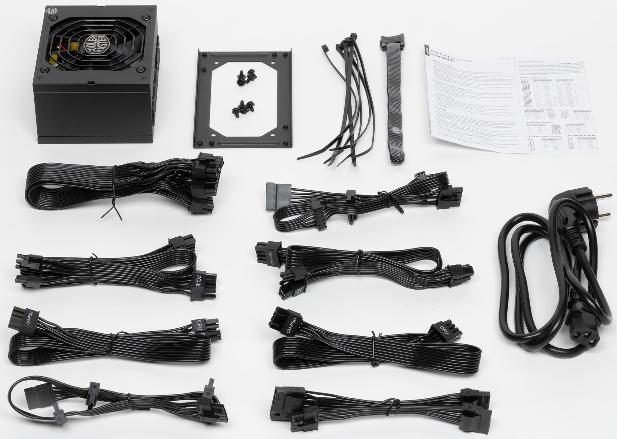 Поставляется блок питания в коробке с фирменной расцветкой Cooler Master — в фиолетово-черных тонах с белыми надписями. Стоит отметить, что в комплекте присутствует переходник, позволяющий установить блок питания формата SFX на посадочное место блока питания ATX. В некоторых случаях подобные переходники очень востребованы, так как позволяют установить подобные БП в компактные корпуса, которые изначально рассчитаны на использование полноразмерных блоков питания. Например, их можно установить в корпуса Cooler Master серии H.