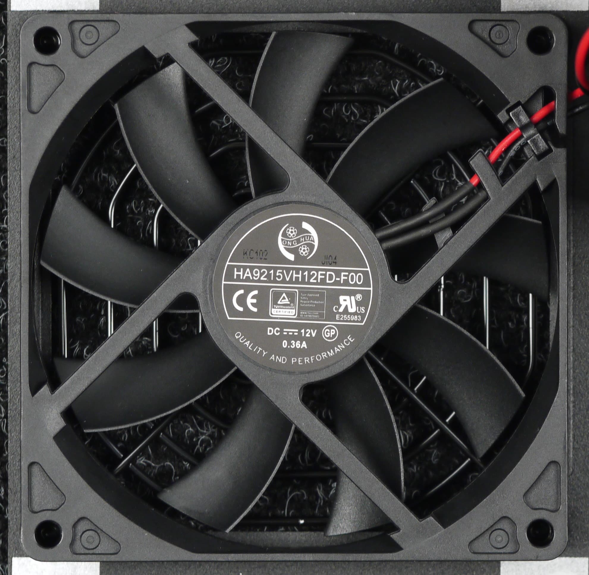 В блоке питания установлен вентилятор HA9215VH12FD, он основан на гидродинамическом подшипнике и изготовлен компанией Dongguan Honghua Electronic Technology. Подключение вентилятора — двухпроводное, через разъем.