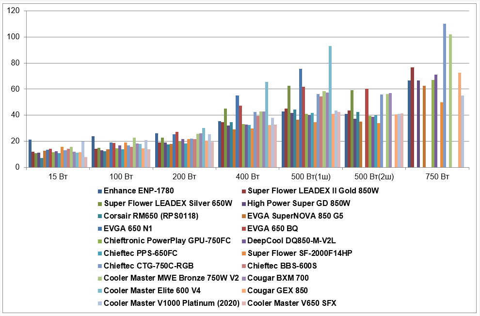 | Super Flower Leadex Silver 650W | 10,9 | 15,1 | 22,8 | 45 | 62,5 | 59,2 | |