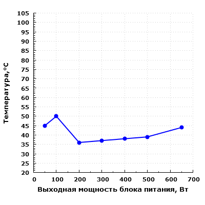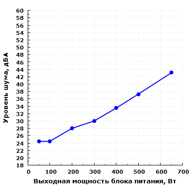 При дальнейшем увеличении выходной мощности уровень шума заметно повышается, и при нагрузке в 650 Вт он превышает значение 40 дБА при условии настольного размещения, то есть при расположении блока питания в ближнем поле по отношению к пользователю. Подобный уровень шума можно охарактеризовать как высокий.