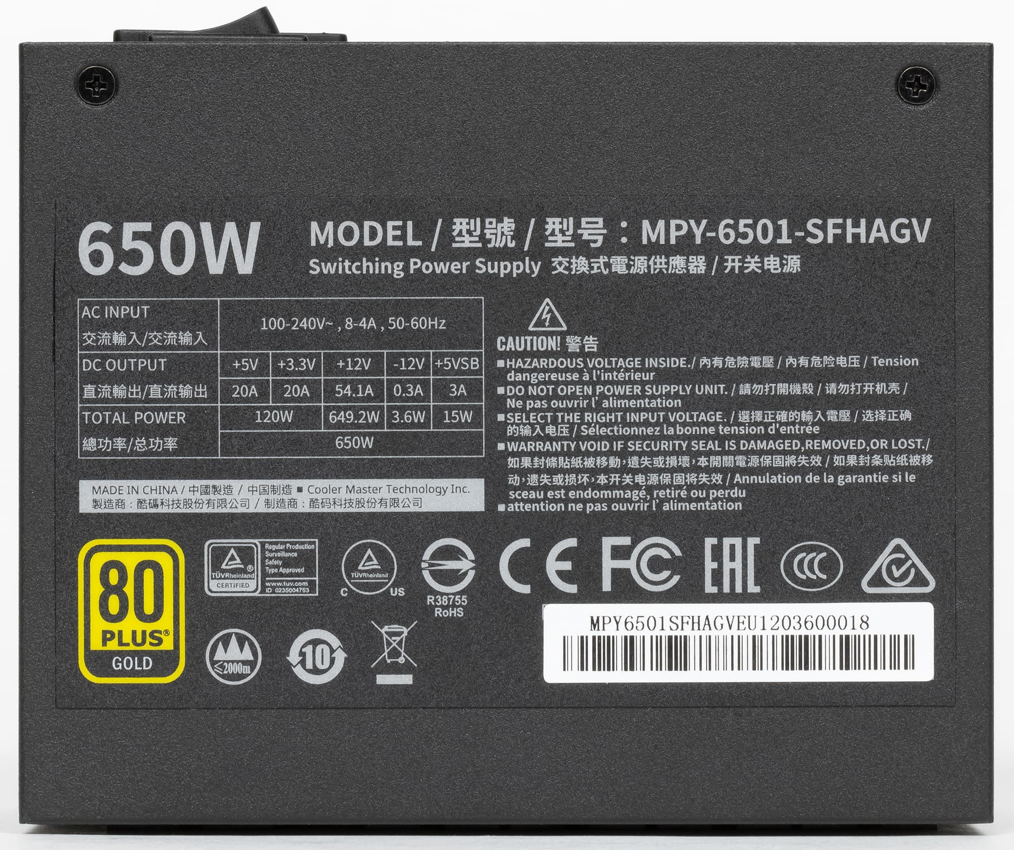 Все необходимые параметры указаны на корпусе блока питания в полном объеме, для мощности шины +12VDC заявлено значение 649,2 Вт. Соотношение мощности по шине +12VDC и полной мощности составляет 0,9988, что, разумеется, является отличным показателем.