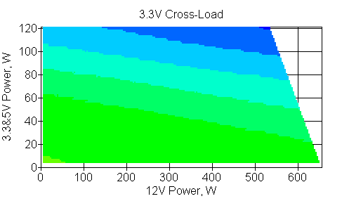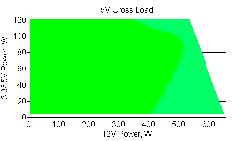 Следующим этапом инструментального тестирования является построение кросснагрузочной характеристики (КНХ) и представление ее на четвертьплоскости, ограниченной максимальной мощностью по шине 3,3&5 В с одной стороны (по оси ординат) и максимальной мощностью по шине 12 В с другой (по оси абсцисс). В каждой точке измеренное значение напряжения обозначается цветовым маркером в зависимости от отклонения от номинального значения.