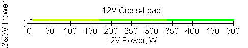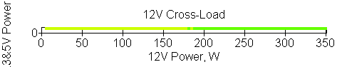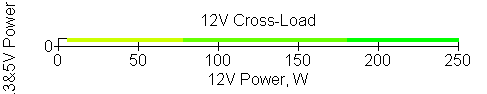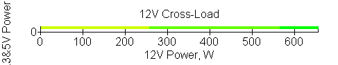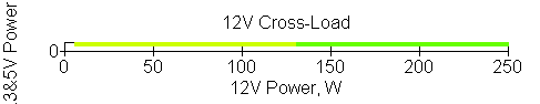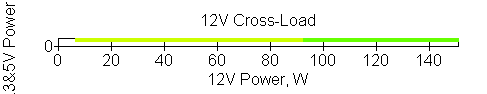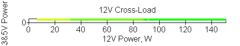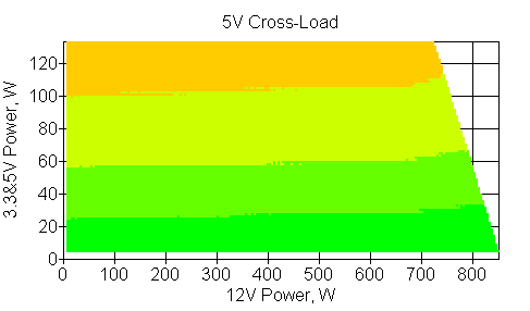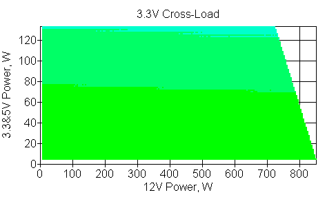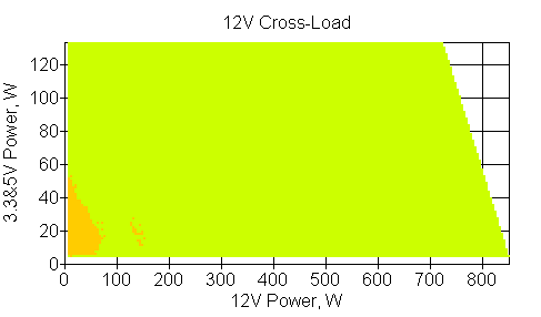 Следующим этапом инструментального тестирования является построение кросснагрузочной характеристики (КНХ) и представление ее на четвертьплоскости, ограниченной максимальной мощностью по шине 3,3&5 В с одной стороны (по оси ординат) и максимальной мощностью по шине 12 В с другой (по оси абсцисс). В каждой точке измеренное значение напряжения обозначается цветовым маркером в зависимости от отклонения от номинального значения.