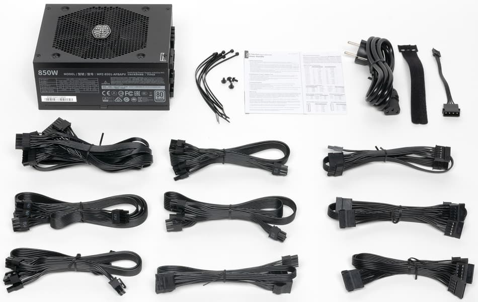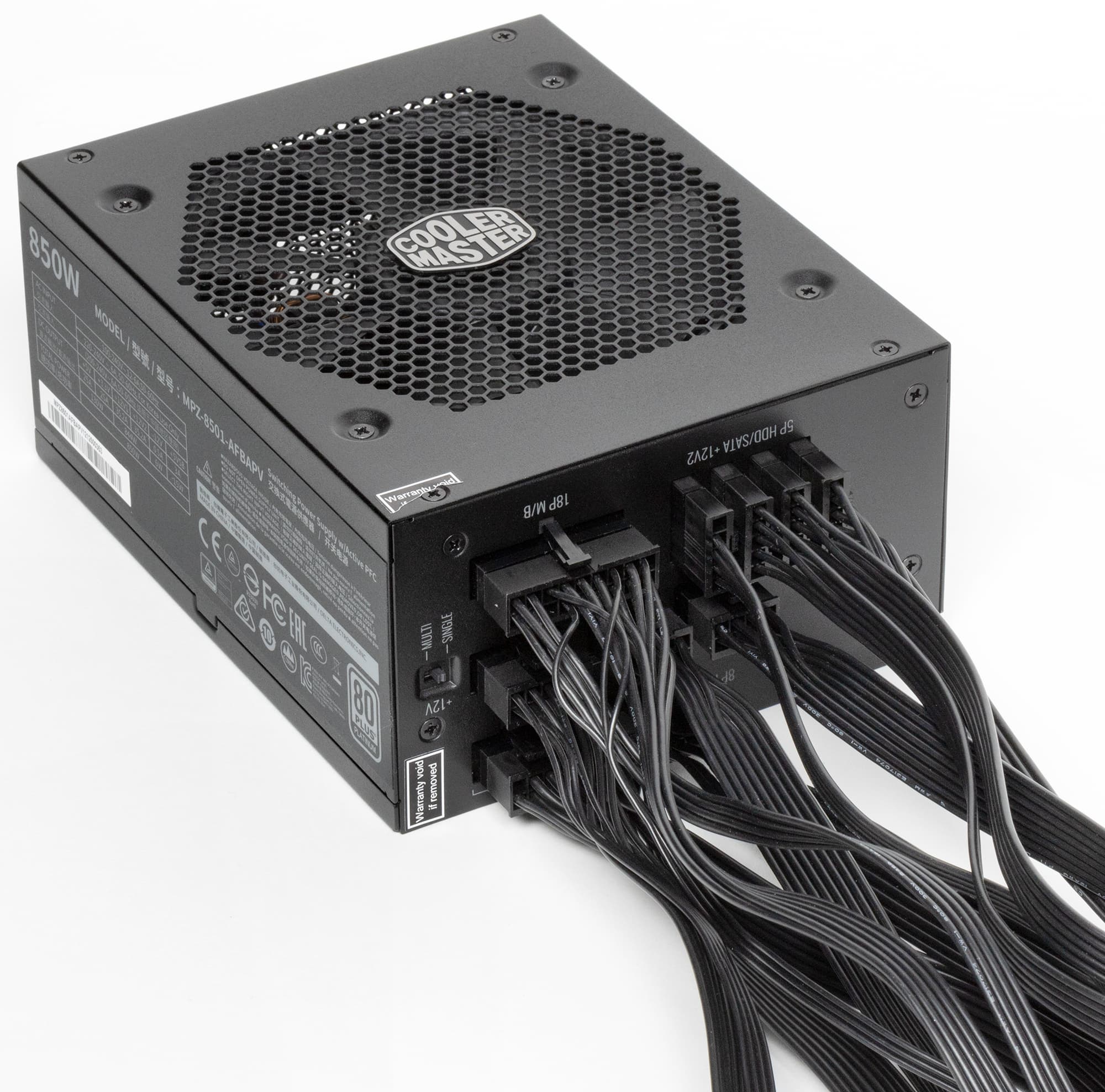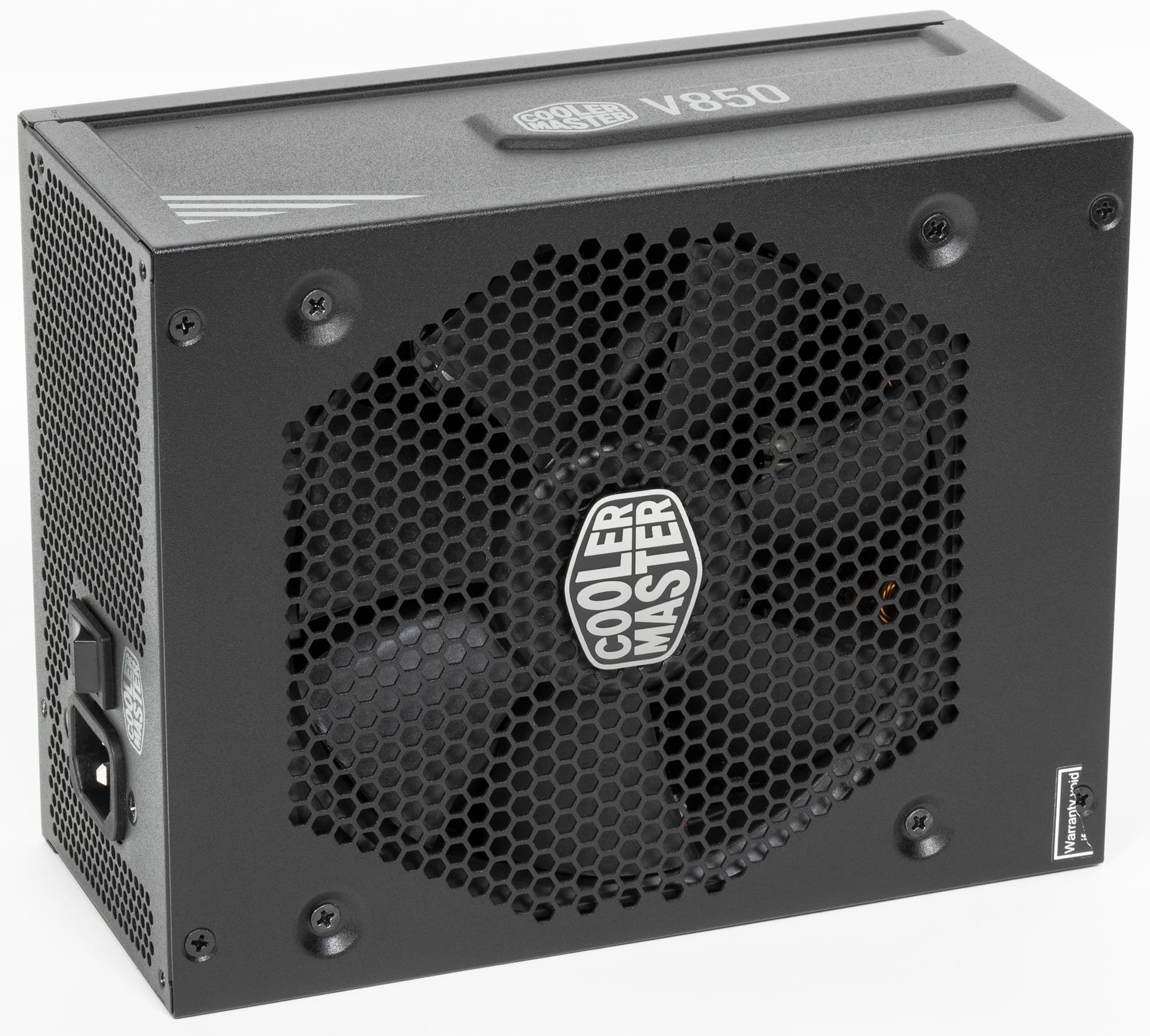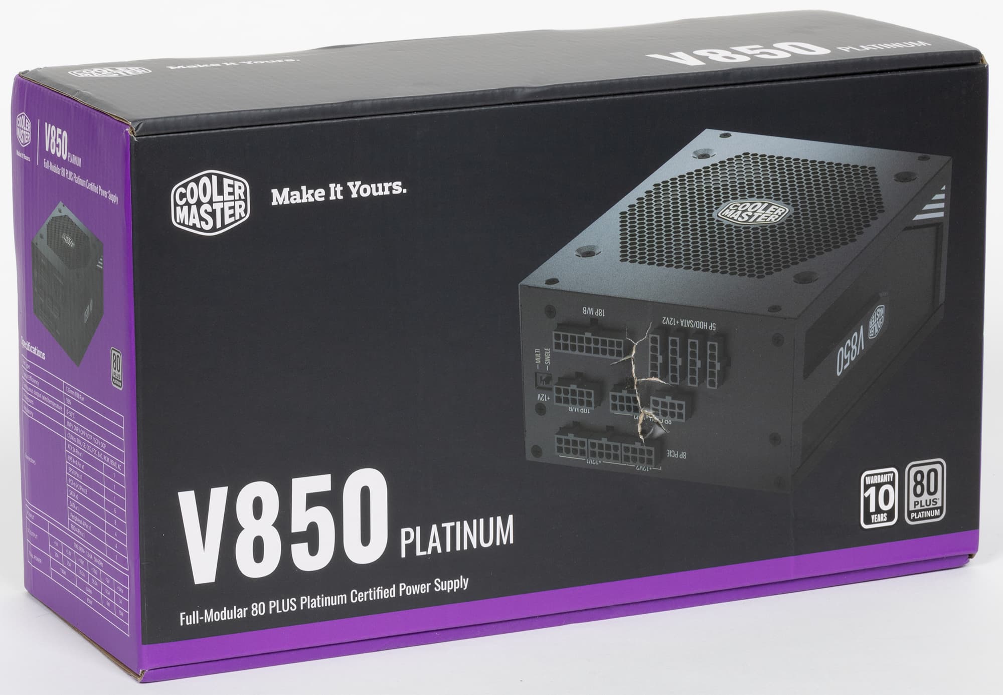 У нас в лаборатории оказался источник питания Cooler Master V850 Platinum, имеющий максимальную выходную мощность 850 Вт. Помимо него в данной серии представлены модели мощностью 1000, 1200 и 1300 Вт, все они характеризуются использованием японских конденсаторов, а также наличием сертификата 80Plus Platinum.
