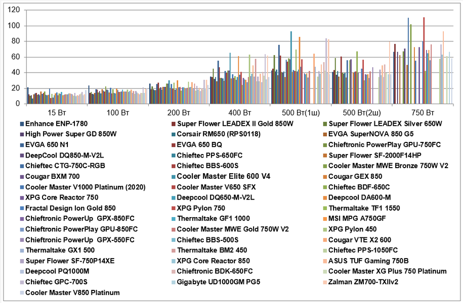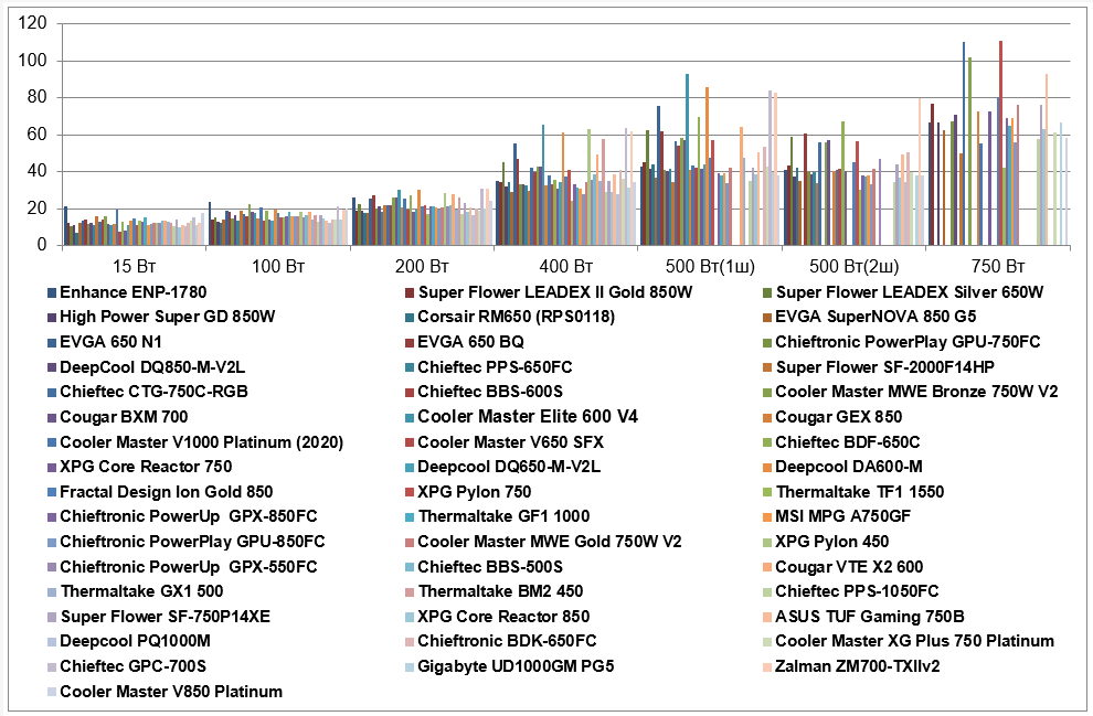 Мы решили выделить несколько типовых вариантов по мощности и соотнести их с количеством разъемов, которое соответствует данным вариантам, то есть максимально приблизить методику измерения экономичности к условиям, которые достигаются в реальном системном блоке. Вместе с тем, это позволит оценивать экономичность разных блоков питания в полностью одинаковых условиях.