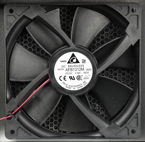 Под штампованной решеткой установлен вентилятор AFB1312M типоразмера 135 мм производства Delta Electronics. Данная модель вентилятора основана на подшипнике качения и имеет максимальную скорость вращения 4500 об/мин при номинальном напряжении питания 12 В. Подключение вентилятора — двухпроводное, через разъем.