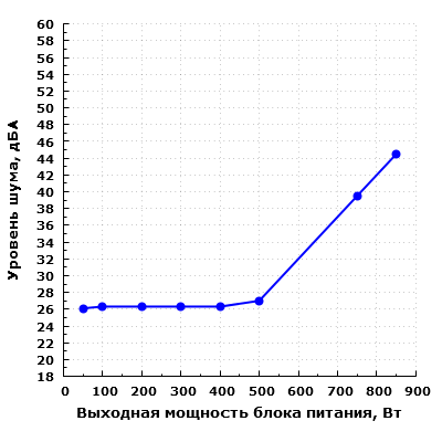 При дальнейшем увеличении выходной мощности уровень шума заметно повышается. При работе на мощности 750 Вт уровень шума данной модели приближается к 40 дБА при расположении БП в ближнем поле, а на мощности 850 Вт уровень шума уже заметно превышает эргономичный порог в 40 дБА.