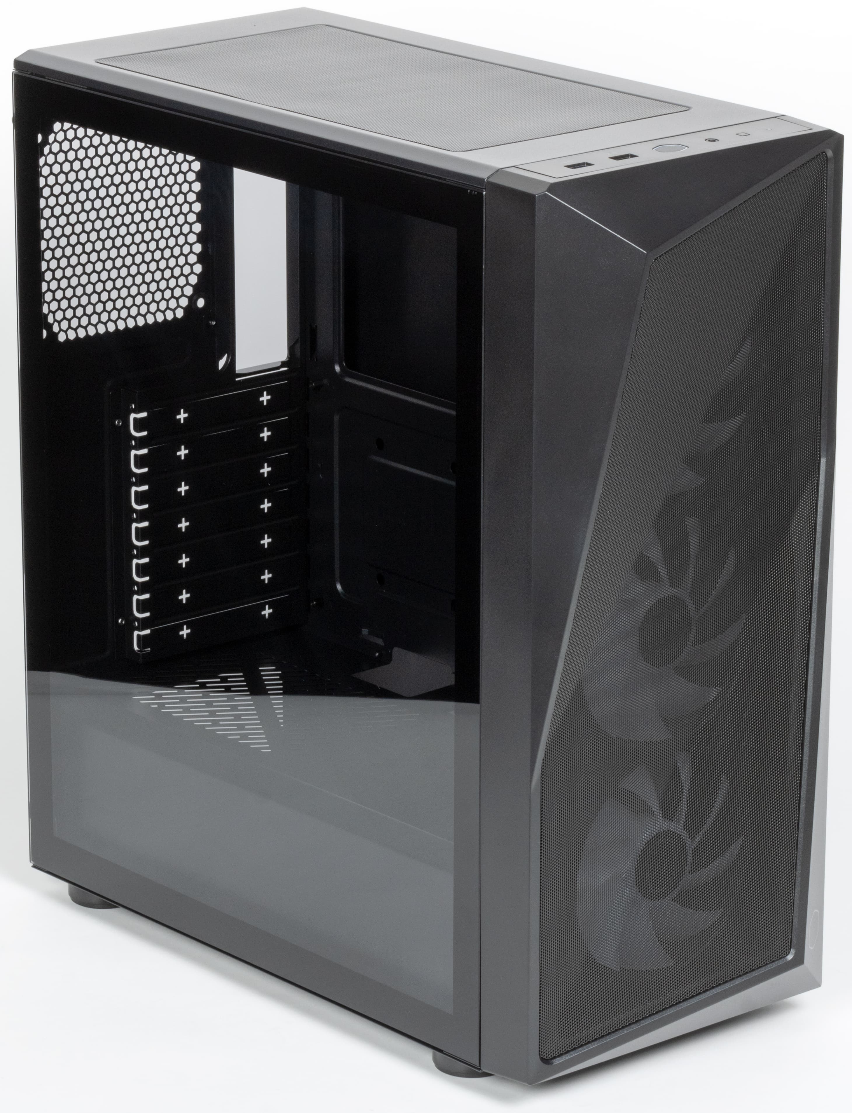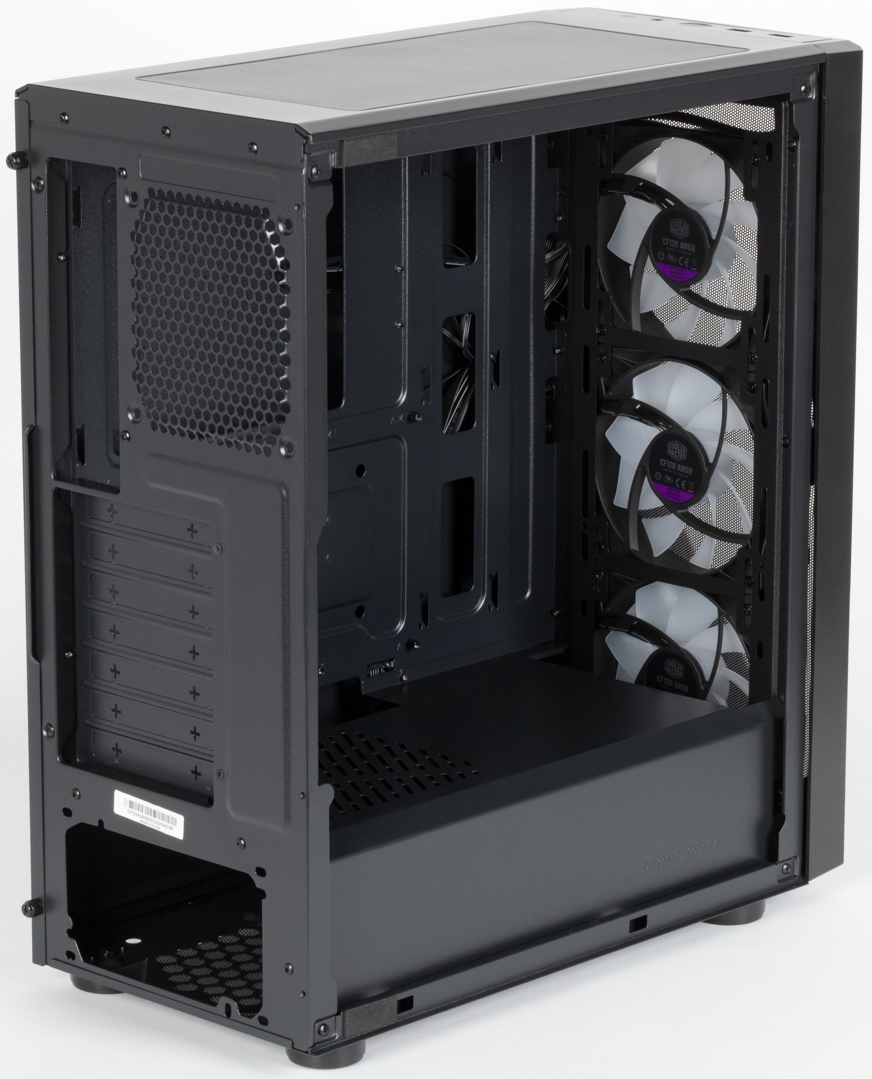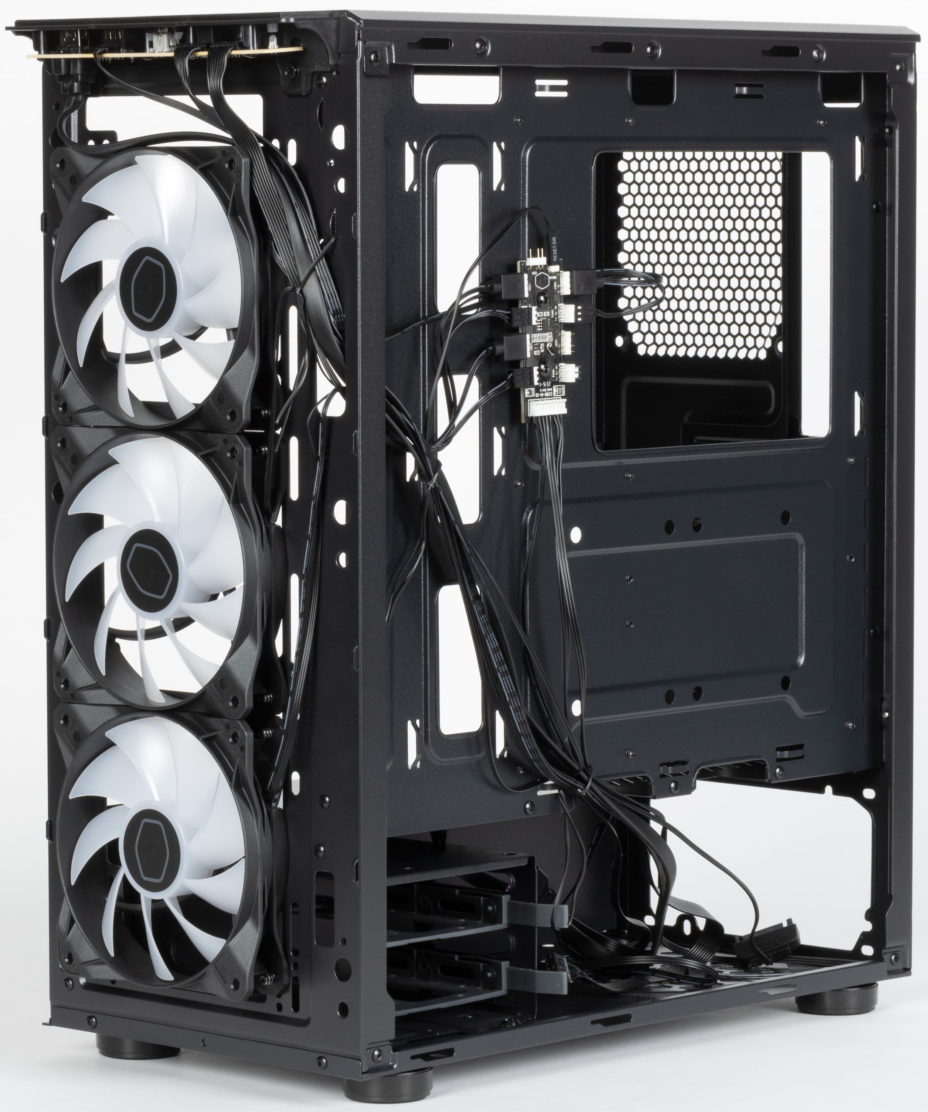 В корпусе предусмотрена возможность установки вентиляторов типоразмера 120 и 140 мм, посадочные места для них имеются спереди, сверху и сзади. Штатно установлено три вентилятора типоразмера 120 мм — все спереди. Эти вентиляторы имеют по два разъема: стандартный трехконтактный разъем с возможностью подключения к системной плате с управлением питающим напряжением и стандартный трехконтактный c колодкой 1×4 (ARGB) для управления подсветкой. Также в корпус можно установить до трех радиаторов, причем спереди — до 280 мм, а сверху — до 240 мм.
