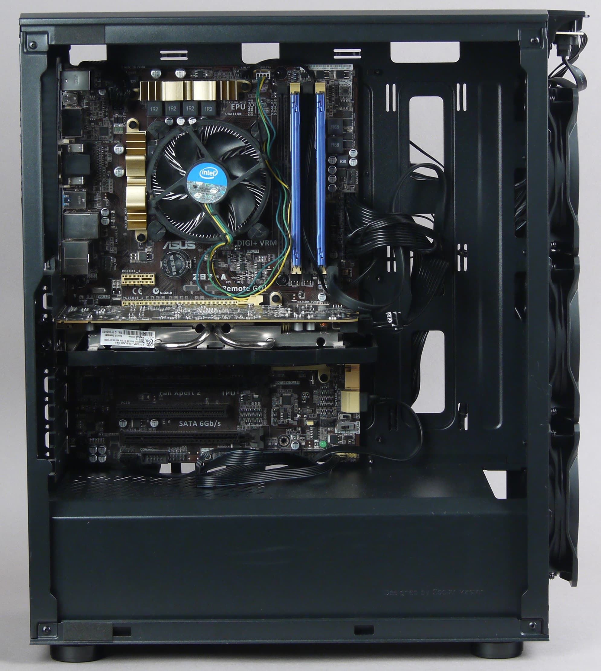 Порядок сборки ПК в данном корпусе особого значения не имеет, так как компоненты разнесены и не мешают друг другу, но лучше начать с установки блока питания и прокладки проводов. БП устанавливается с правой стороны и фиксируется при помощи четырех винтов. На посадочном месте для БП виброизолирующие накладки отсутствуют.