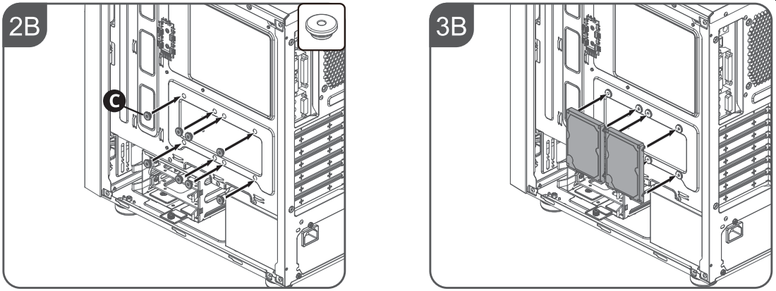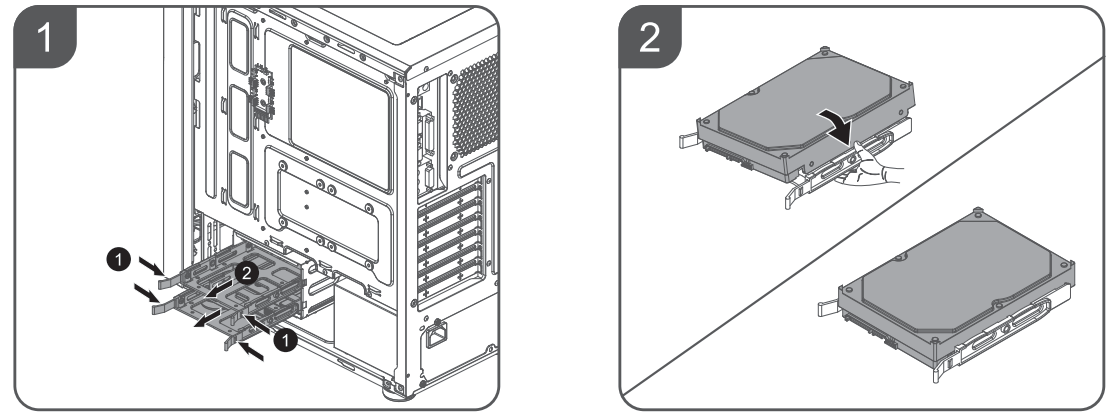 Полноразмерные жесткие диски устанавливаются в предназначенную для них двухместную корзину.
