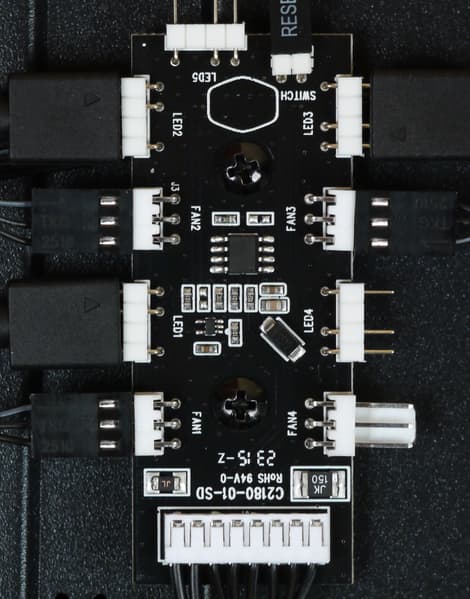 Контроллер в корпусе установлен действительно многофункциональный: помимо управления подсветкой, он умеет управлять еще и скоростью вращения четырех вентиляторов с трехконтактными разъемами с управлением скоростью вращения питающим напряжением.