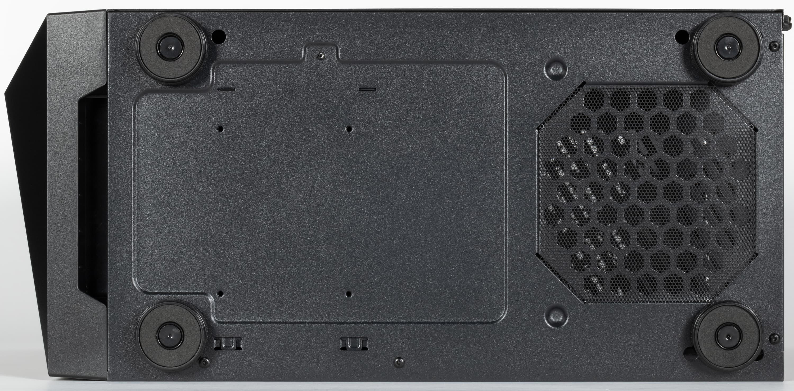 Всего в корпус можно установить 4 накопителя формата 2,5 дюйма или 2×3,5″ и 2×2,5″. Этого более чем достаточно для типичного домашнего или офисно-рабочего компьютера. Корзину обдувает передний вентилятор.