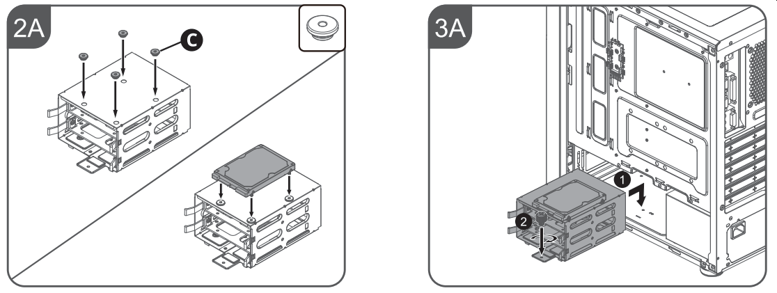 Диски устанавливаются в корзину через пластиковые рамки, фиксируются при помощи винтов через дно и сбоку. В корзину можно установить как полноразмерный диск, так и накопитель формата 2,5 дюйма.