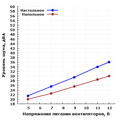 При большем удалении корпуса от пользователя и размещении его, к примеру, на полу под столом, шум можно будет охарактеризовать как минимально заметный при питании вентиляторов от 5 В, а при питании вентиляторов от 12 В — как приближающийся к пониженному для жилого помещения в дневное время суток.