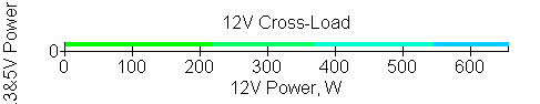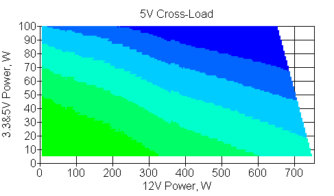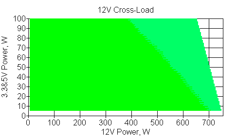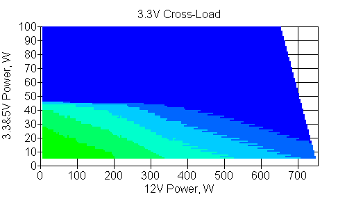 Следующим этапом инструментального тестирования является построение кросснагрузочной характеристики (КНХ) и представление ее на четвертьплоскости, ограниченной максимальной мощностью по шине 3,3&5 В с одной стороны (по оси ординат) и максимальной мощностью по шине 12 В с другой (по оси абсцисс). В каждой точке измеренное значение напряжения обозначается цветовым маркером в зависимости от отклонения от номинального значения.