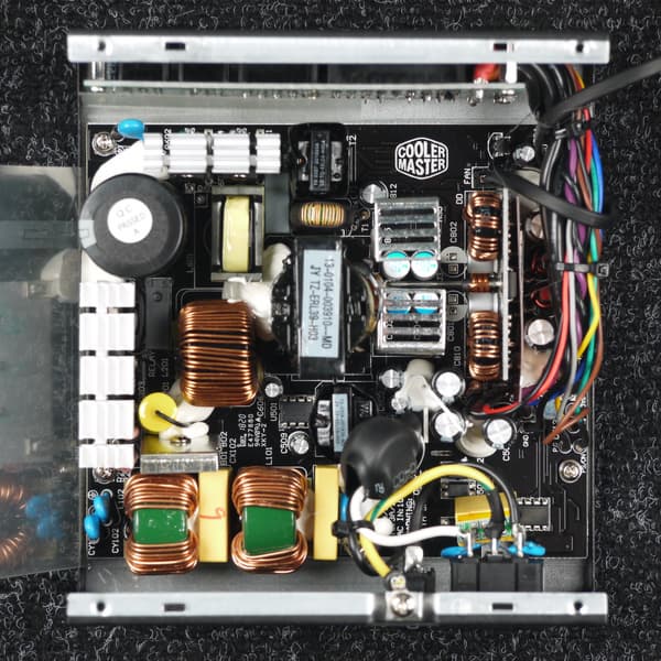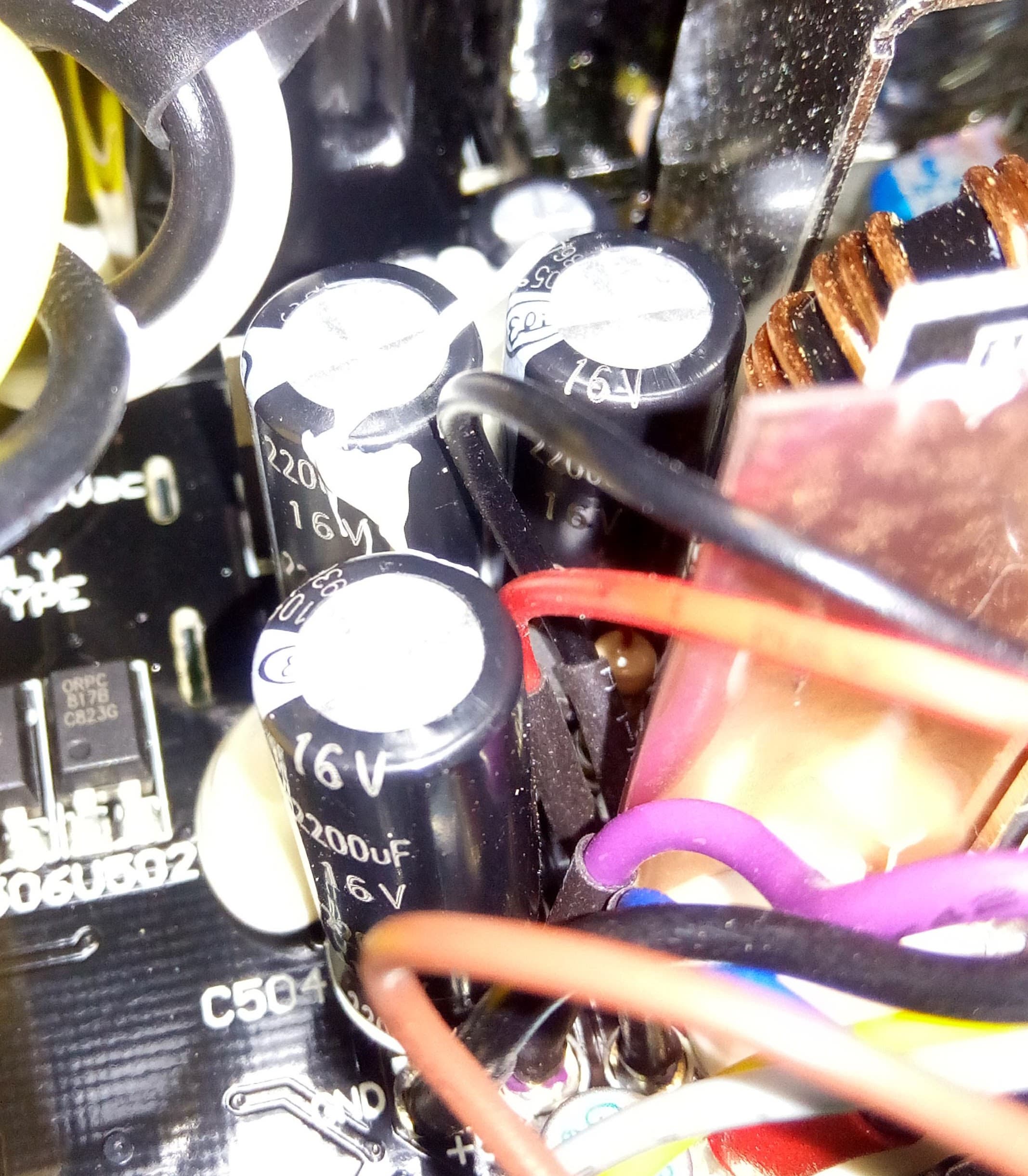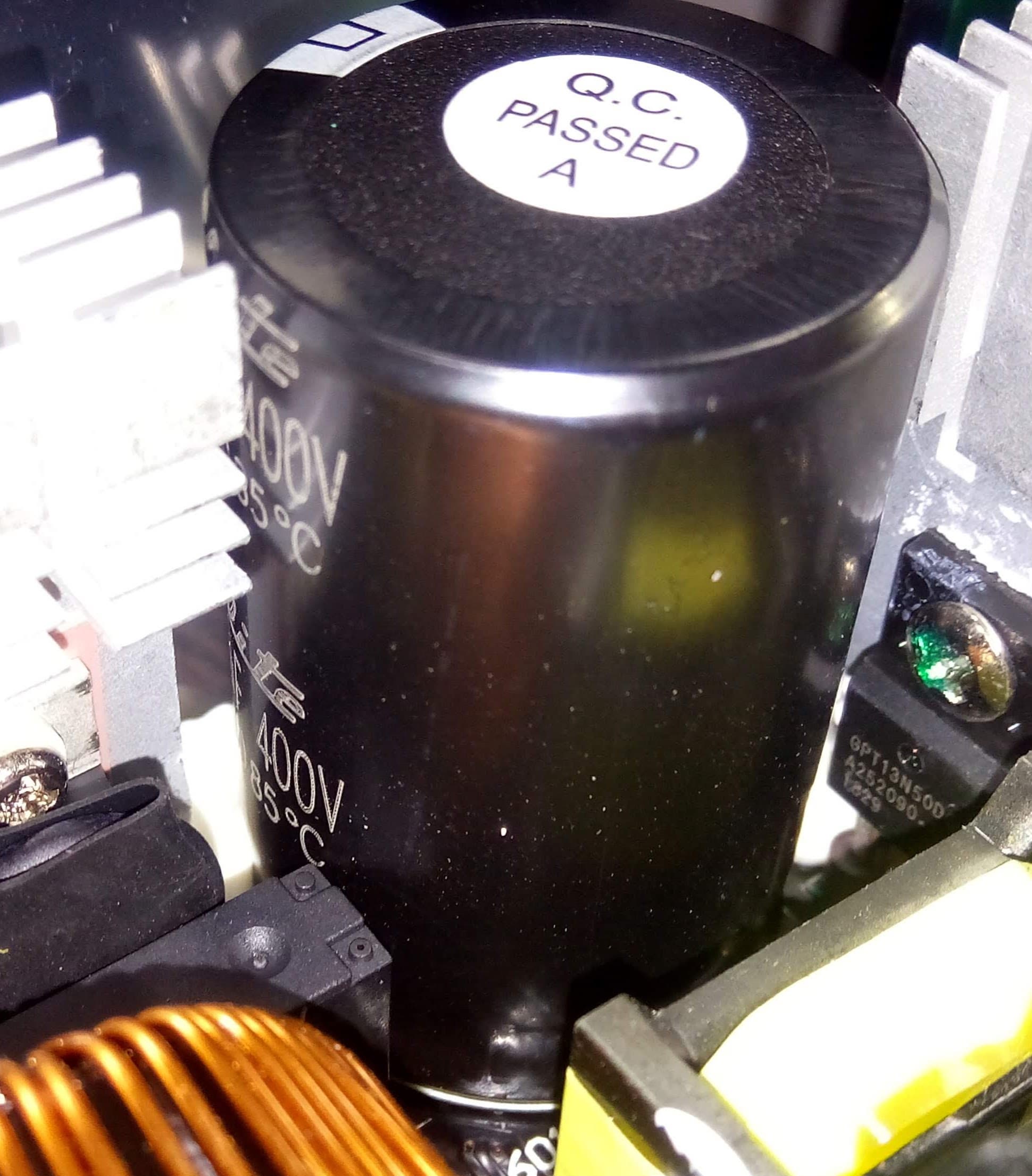 Высоковольтные силовые элементы установлены на двух радиаторах средних размеров, транзисторы синхронного выпрямителя установлены с оборотной стороны основной печатной платы, элементы импульсных преобразователей каналов +3.3VDC и +5VDC размещены на дочерней печатной плате, установленной вертикально (дополнительного теплоотвода там нет).