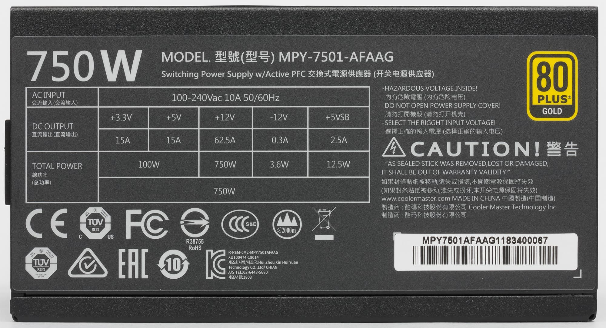 Все необходимые параметры указаны на корпусе блока питания в полном объеме, для мощности шины +12VDC заявлено значение 750 Вт. Соотношение мощности по шине +12VDC и полной мощности составляет 1,0, что является отличным показателем.