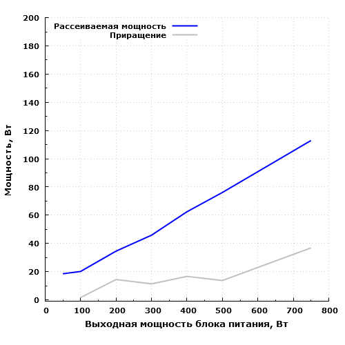 Экономичность модели находится на вполне достойном уровне: на максимальной мощности БП рассеивает около 113 Вт, 100 Вт он рассеивает на мощности около 650 Вт, а 60 Вт — на мощности около 380 Вт. На мощности 50 Вт блок питания рассеивает 18,5 Вт.
