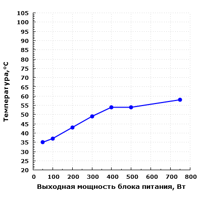 При нагрузке в 750 Вт шум блока питания уже заметно превышает значение в 40 дБА при условии настольного размещения, то есть при расположении блока питания в ближнем поле по отношению к пользователю. Подобный уровень шума можно охарактеризовать как высокий.