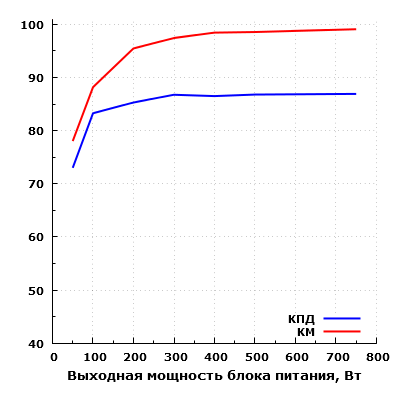 Эффективность БП находится на среднем уровне. Согласно нашим измерениям, КПД данного блока питания достигает значения свыше 86% в диапазоне мощности от 300 до 750 ватт. Максимальное зарегистрированное значение составило 86,9% на мощности 750 Вт. Одновременно с этим, КПД на мощности 50 Вт составил 73%.