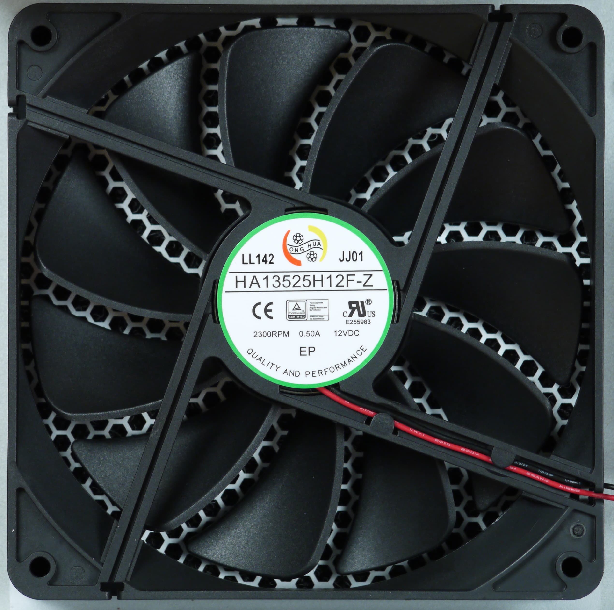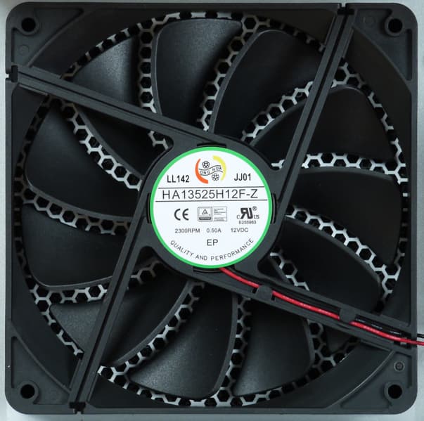 В блоке питания установлен вентилятор HA13525H12F-Z (2300 об/мин), он основан на гидродинамическом подшипнике, что подразумевает очень долгий срок службы. Изготовлен вентилятор компанией Dongguan Honghua Electronic Technology. Подключение вентилятора — двухпроводное, через разъем.