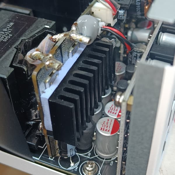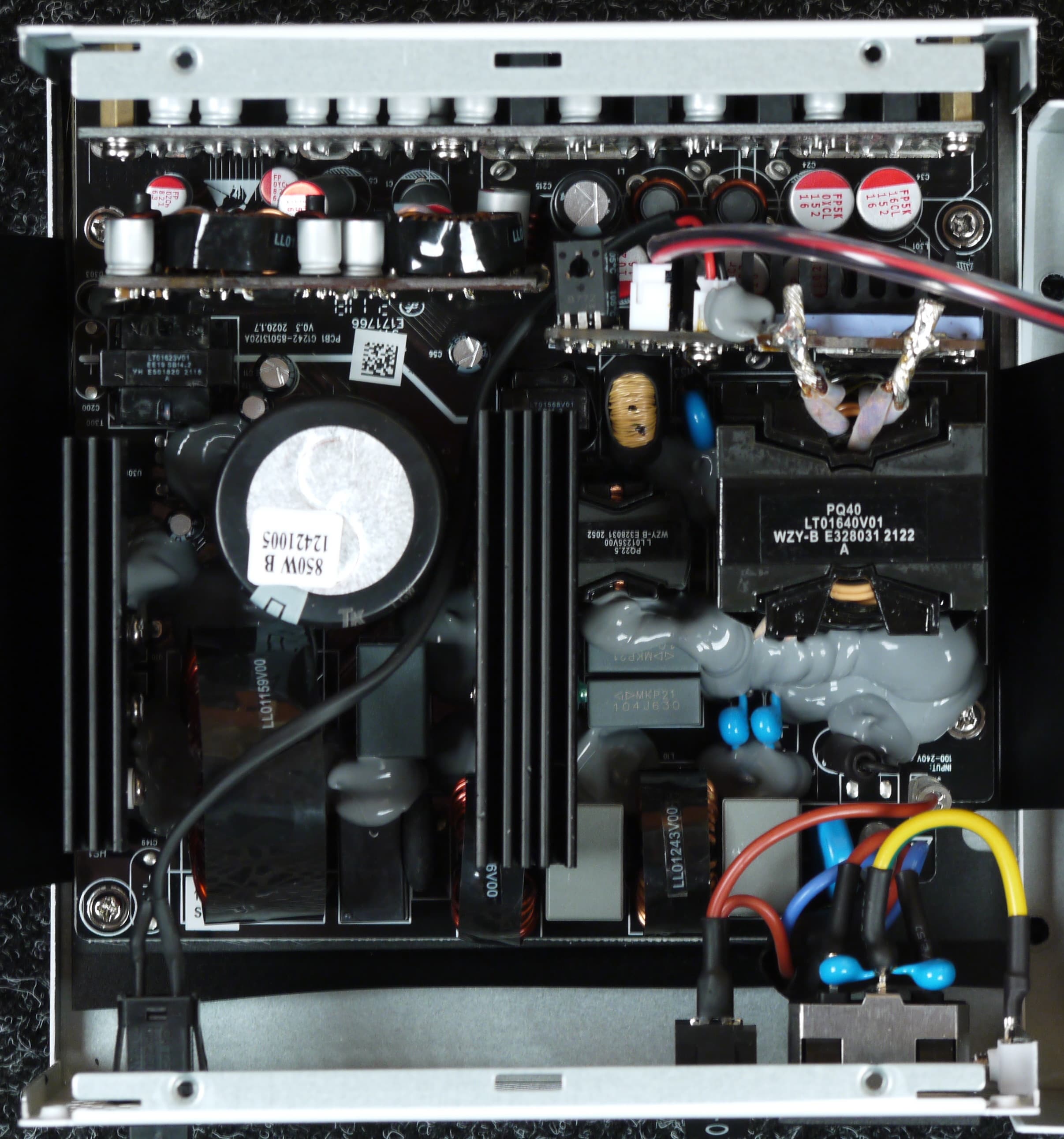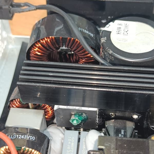 Полупроводниковые элементы высоковольтных цепей размещены на двух радиаторах, там же расположен и входной выпрямитель. Элементы синхронного выпрямителя установлены на дочерней печатной плате, которая размещена вертикально. На элементах синхронного выпрямителя имеется собственный радиатор, установленный через термоинтерфейс.