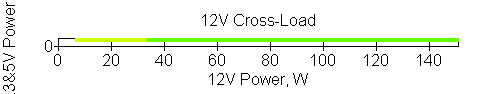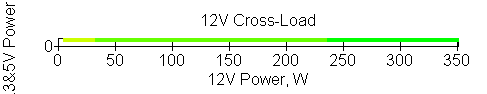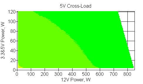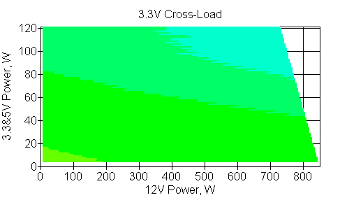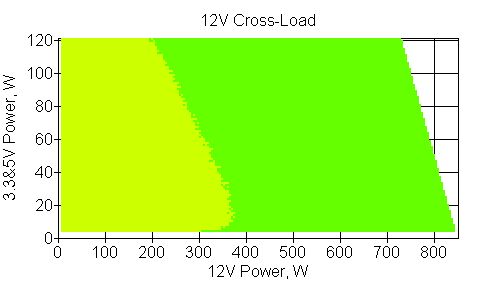 Следующим этапом инструментального тестирования является построение кросснагрузочной характеристики (КНХ) и представление ее на четвертьплоскости, ограниченной максимальной мощностью по шине 3,3&5 В с одной стороны (по оси ординат) и максимальной мощностью по шине 12 В с другой (по оси абсцисс). В каждой точке измеренное значение напряжения обозначается цветовым маркером в зависимости от отклонения от номинального значения.