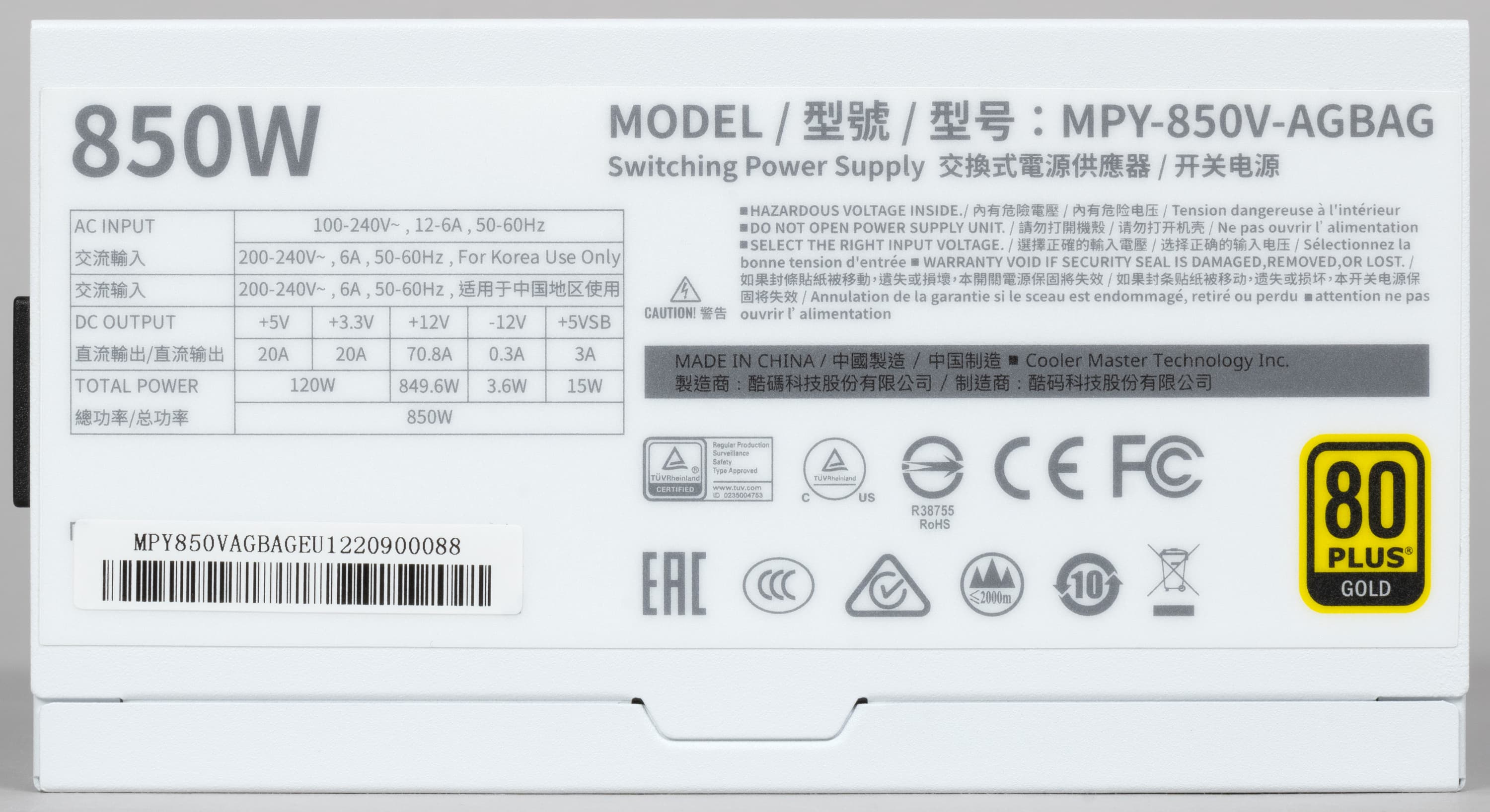 Cooler Master V850 Gold-V2 White Edition продемонстрировал высокую экономичность, в нем использованы вентилятор на гидродинамическом подшипнике с высоким ресурсом работы и конденсаторы японских производителей. Блок питания позволяет включить гибридный режим охлаждения, на мощности до 330 Вт он может длительно работать с остановленным вентилятором. Параметры гибридного режима вполне приемлемые, хотя температура внутри БП при этом может достигать 70 градусов, а работа в подобном температурном режиме не слишком благоприятна для конденсаторов, в том числе полимерных. Данная особенность характерна только для гибридного режима с остановленным вентилятором, в случае работы в режиме с постоянно вращающимся вентилятором термонагруженность заметно ниже.