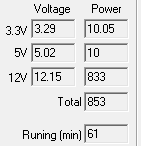 При типичном распределении мощности по каналам отклонения от номинала не превышают 1% по каналу +3.3VDC, 3% по каналу +5VDC и 3% по каналу +12VDC.