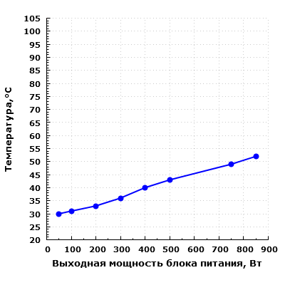 При работе с остановленным вентилятором температура внутри блока питания регистрировалась на уровне около 70 градусов при мощности нагрузки около 350 Вт. Так что все-таки хотелось бы, чтобы вентилятор в гибридном режиме включался несколько раньше. На мощности менее 330 Вт блок питания в состоянии долговременно (не менее двух часов) работать в режиме с остановленным вентилятором. Скачкообразного роста уровня шума при запуске вентилятора отмечено не было. Стоит учитывать, что в случае работы с остановленным вентилятором температура компонентов внутри БП сильно зависит от температуры окружающего воздуха.