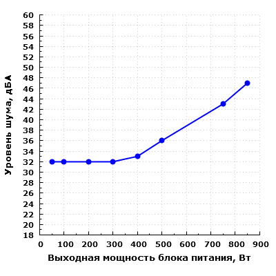 При работе с постоянно вращающимся вентилятором в диапазоне мощности до 500 Вт включительно шум блока питания находится на среднем уровне для жилого помещения в дневное время суток, однако по-настоящему низким он не является никогда.