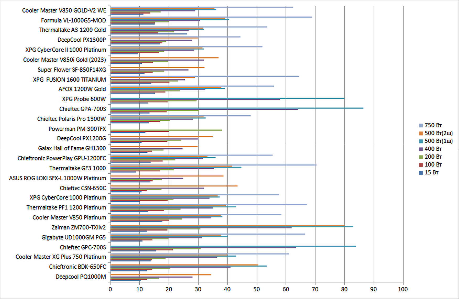 | Cooler Master MWE 750 Bronze V2 | 15,9 | 22,7 | 25,9 | 43,0 | 58,5 | 56,2 | 102,0 |