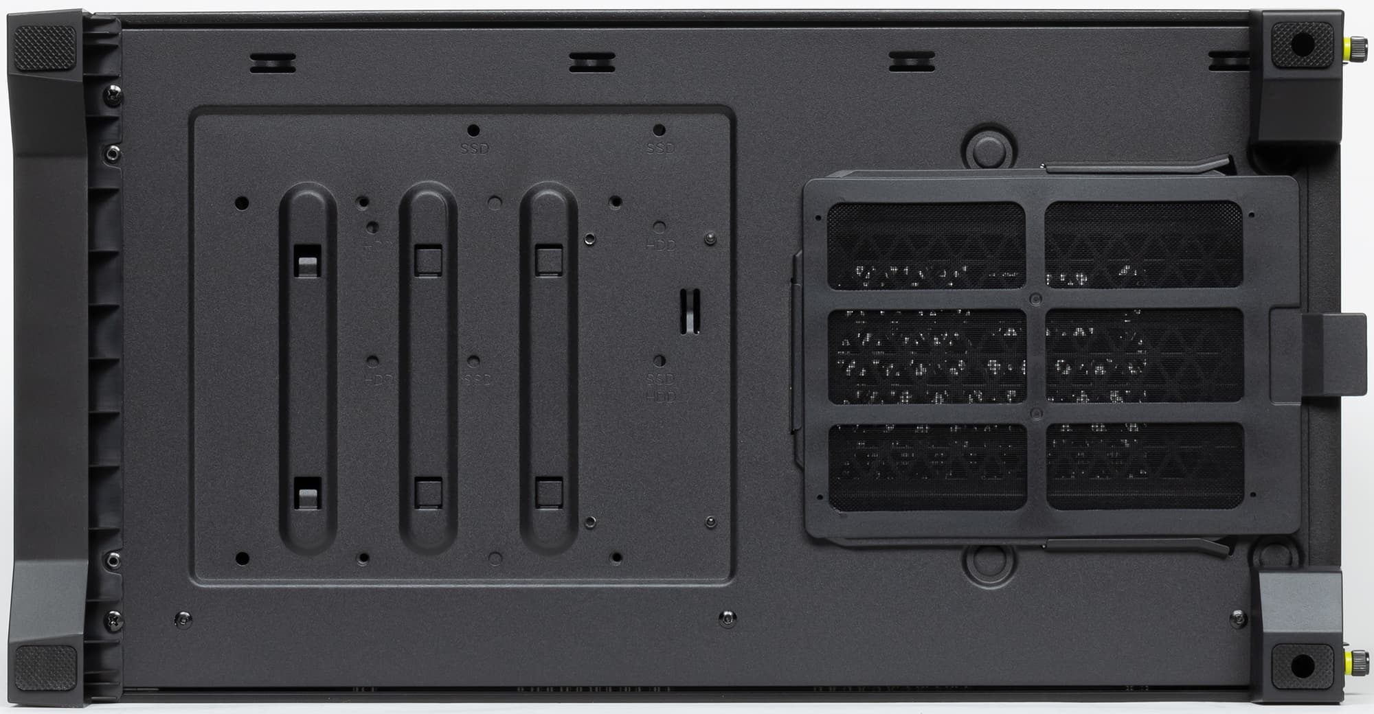 На оборотной стороне основания для системной платы присутствуют места для установки 2,5-дюймовых накопителей. А вот посадочные места для накопителей с внешним доступом в корпусе полностью отсутствуют.