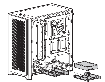 Полноразмерные жесткие диски устанавливаются в предназначенную для них двухместную корзину через пластиковые рамки. Диск крепится к ним с помощью четырех пластиковых штырей.