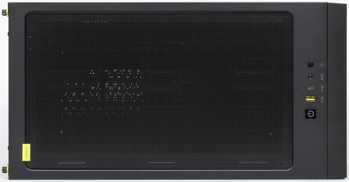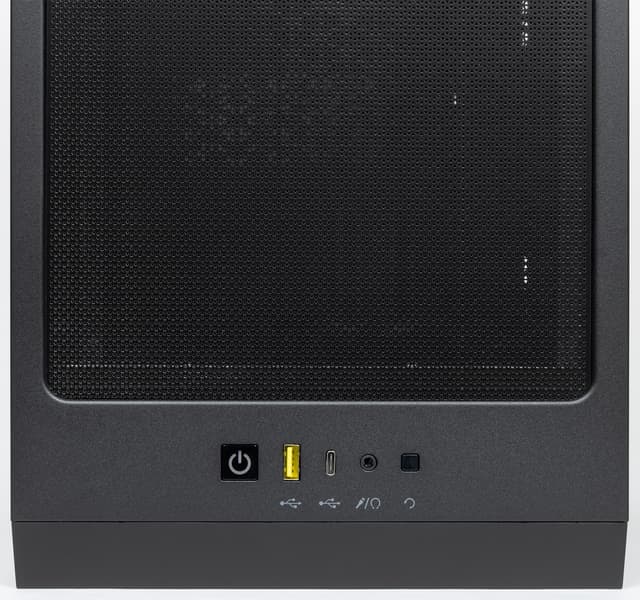 На верхней стенке в передней части корпуса размещены органы управления и коммутации. В их состав входят один порт USB3 Gen1 (USB 3.0) Type-A, один порт USB3 Gen2 (USB 3.1) Type-C и комбинированный разъем для подключения микрофона и наушников или гарнитуры. Таким образом, корпус позволяет подключать проводные гарнитуры как с цифровым, так и с аналоговым интерфейсом со стороны передней панели. На фоне бюджетных моделей, в которых до сих пор можно встретить пару USB 2.0, здесь все отлично. Но разъемов USB все-таки хотелось бы видеть чуть больше, один разъем Type-A — это, конечно, не очень здорово для корпуса с таким позиционированием и ценником.